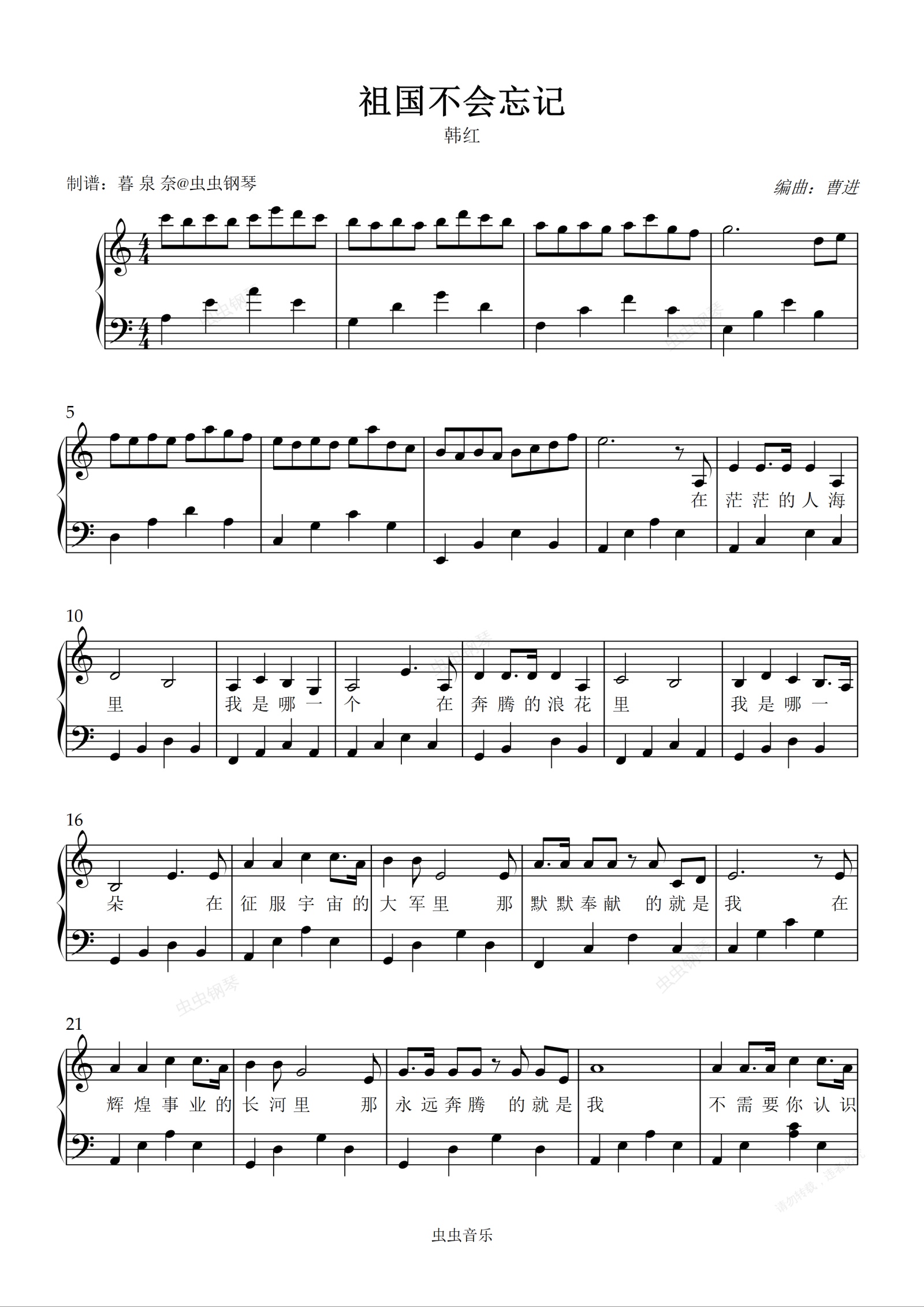 钢琴谱:祖国不会忘记 钢琴谱(带歌词)- C调
