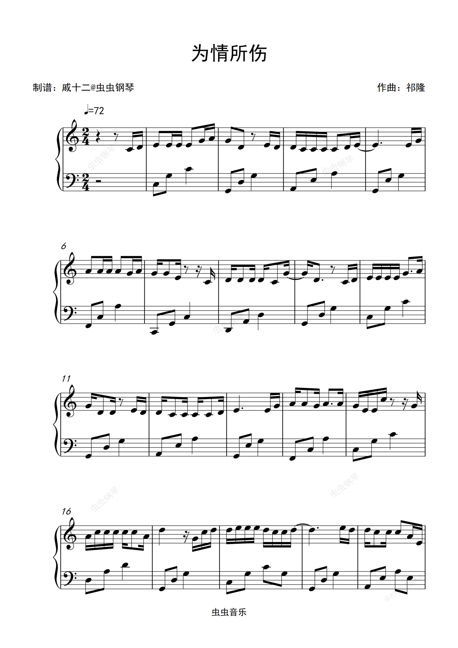 钢琴谱:为情所伤-C调简单版