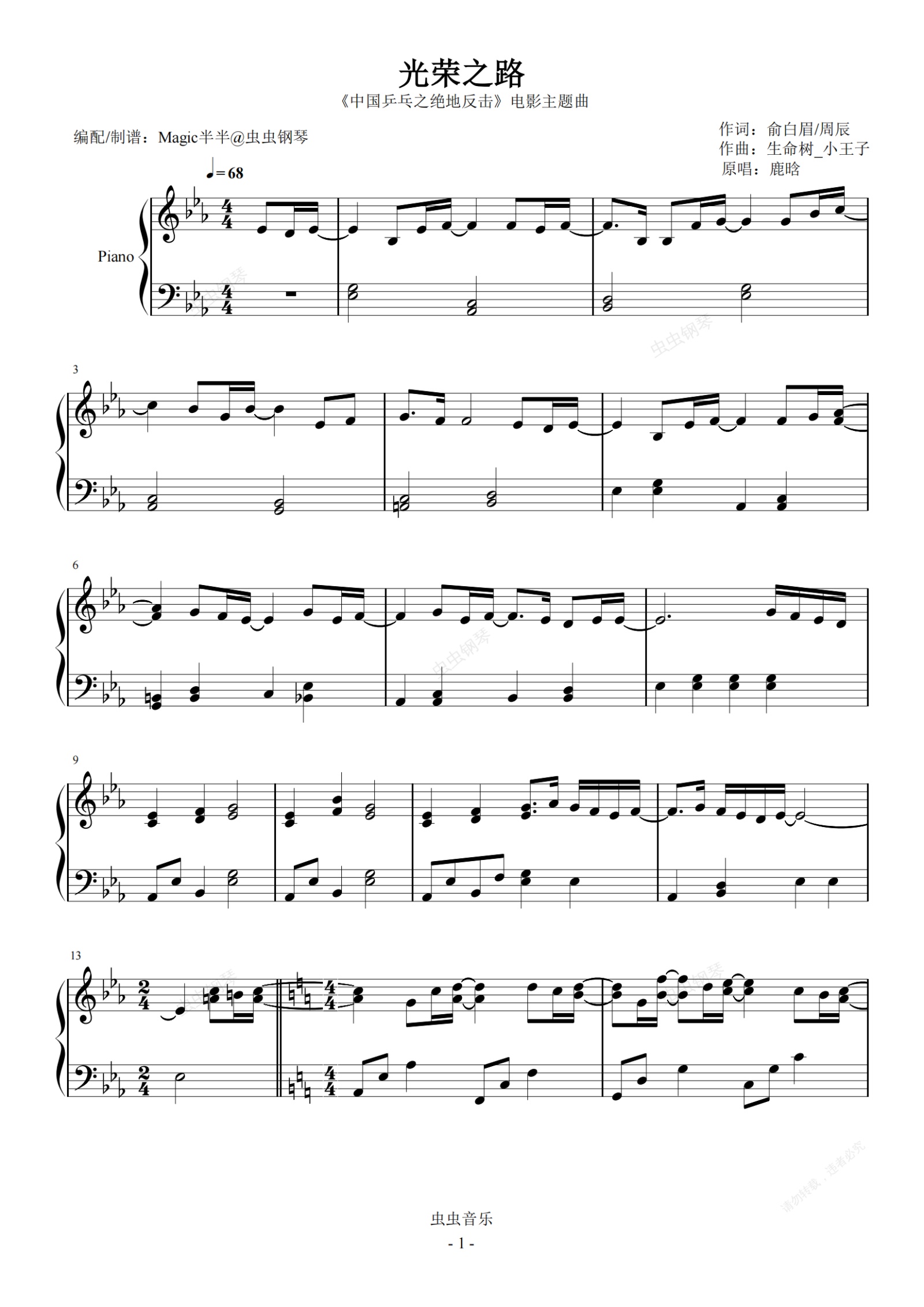 钢琴谱:光荣之路 鹿晗 <中国乒乓之绝地反击>主题曲