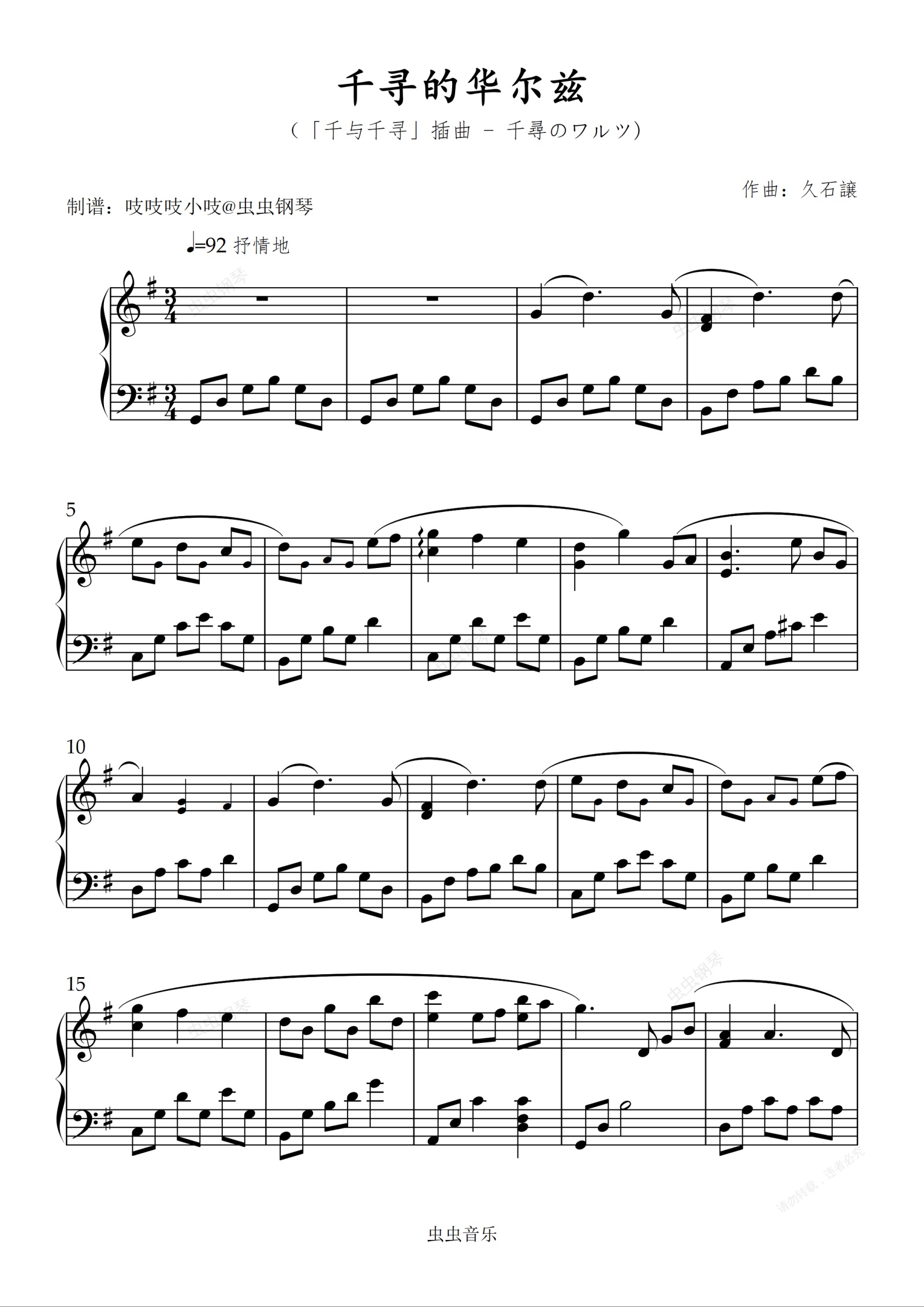 钢琴谱:千尋のワルツ-G(千寻的华尔兹)【初级难度】 吱吱编配