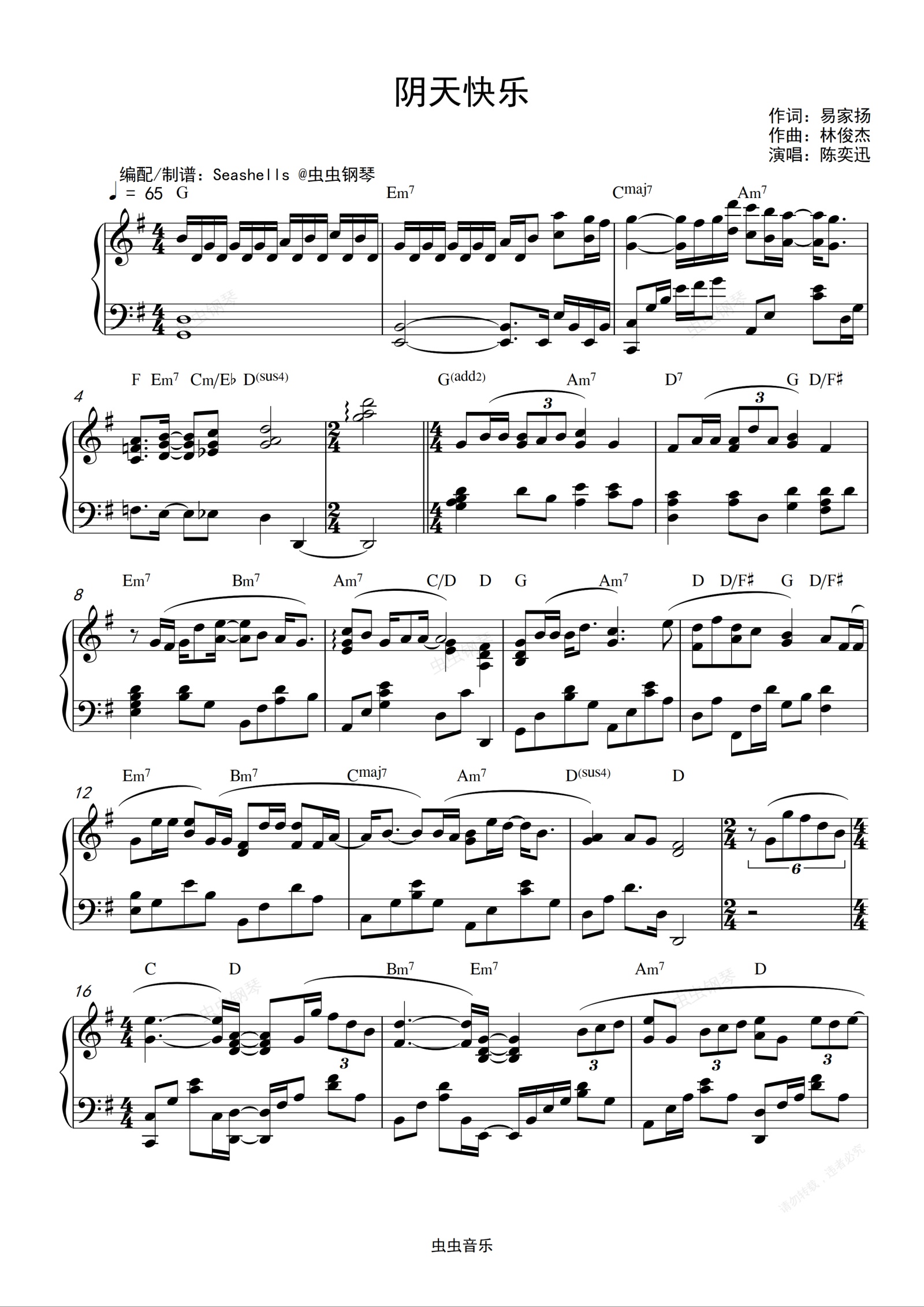 钢琴谱:陈奕迅-《阴天快乐》精编钢琴独奏 G