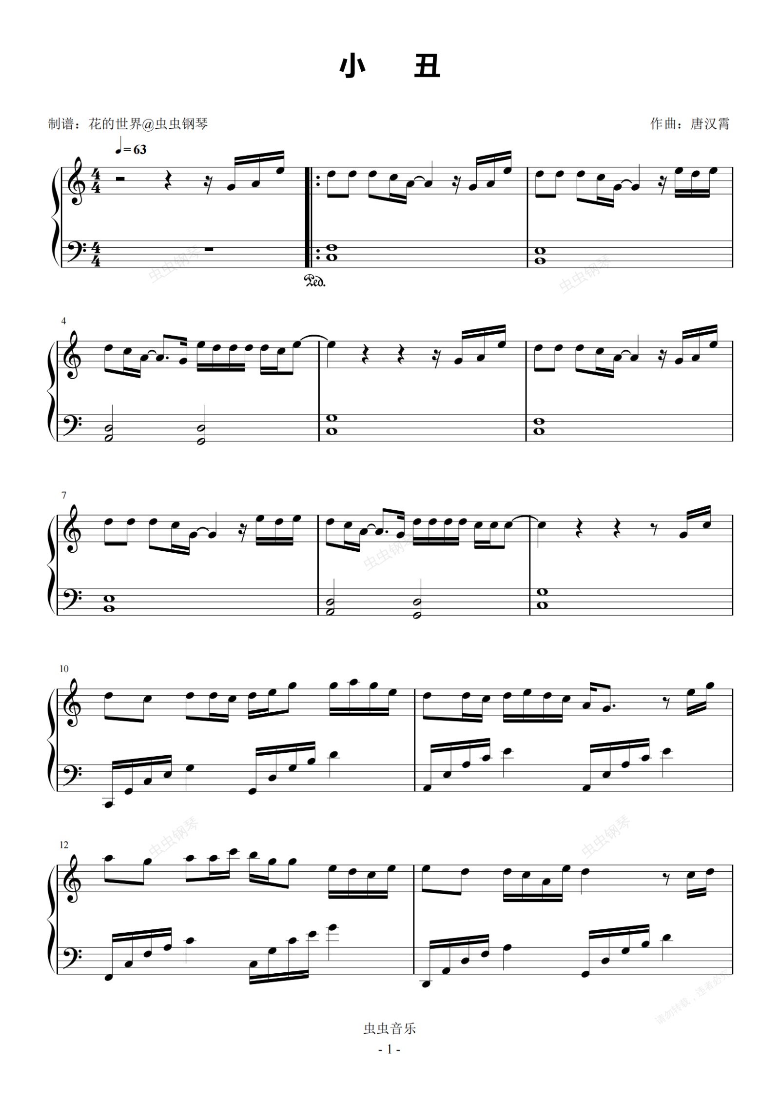 钢琴谱:小丑 C调简易版 毛不易