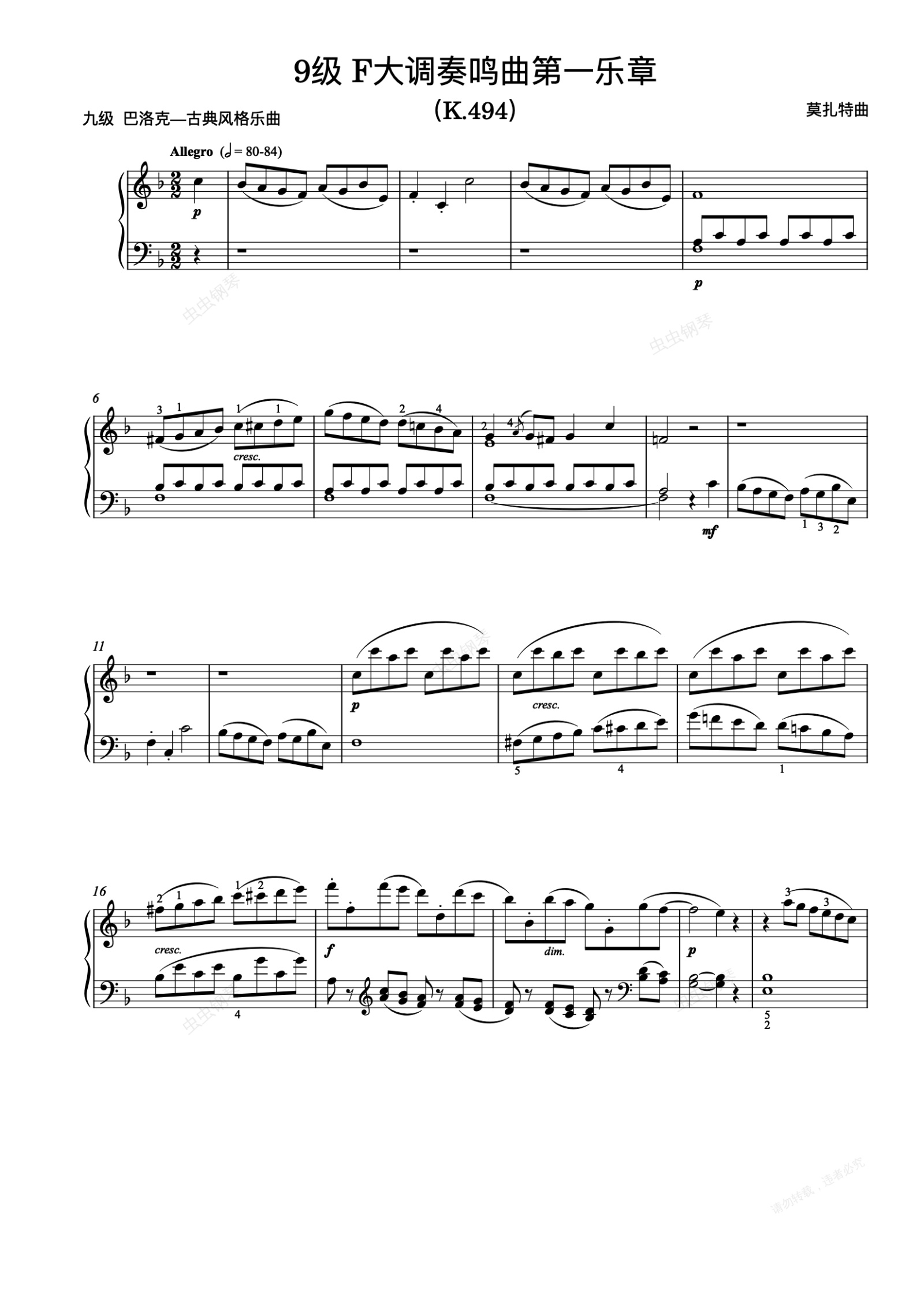 钢琴谱:9级-5-F大调奏鸣曲第一乐章(K.494)