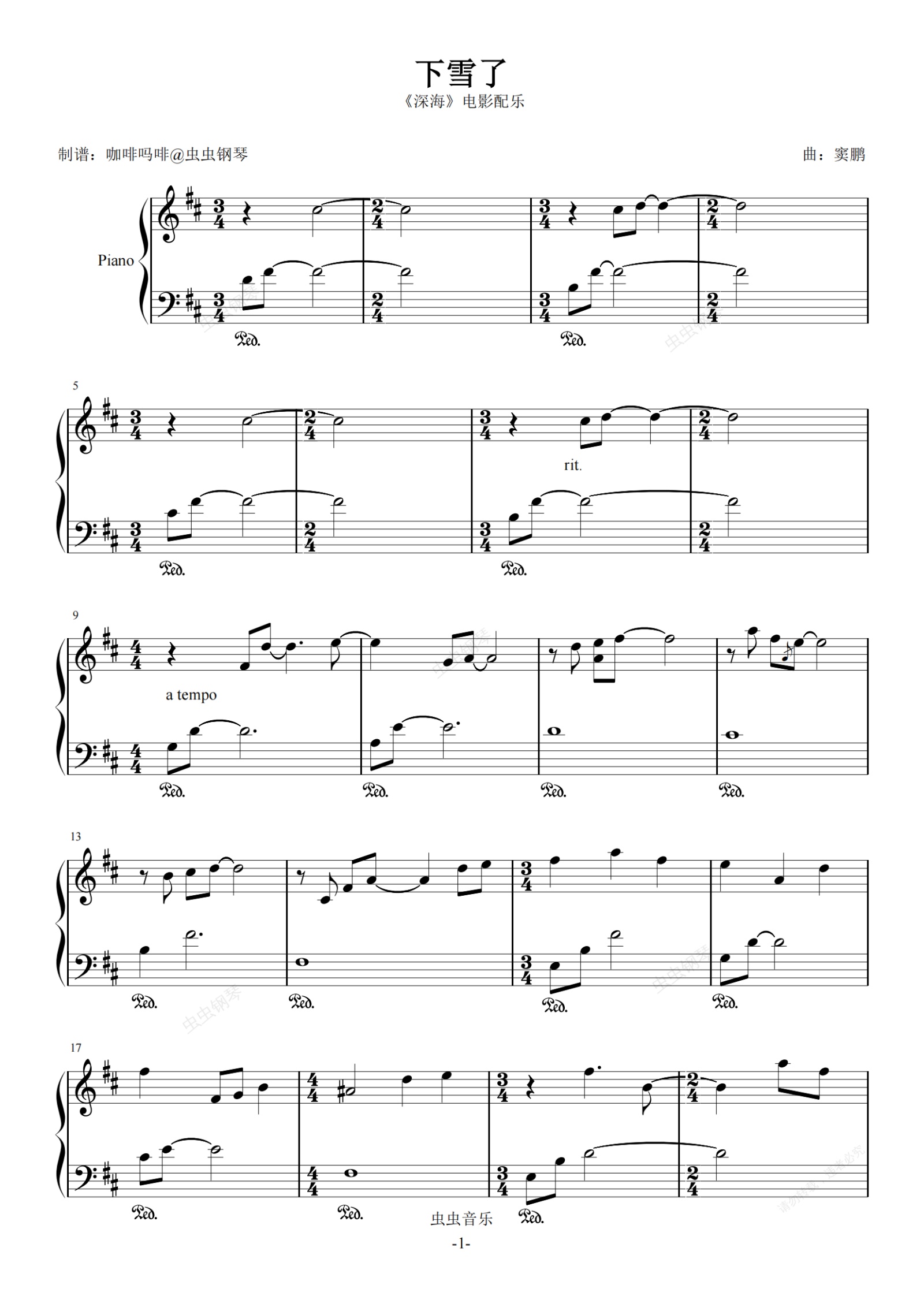 钢琴谱:下雪了-电影《深海》配乐曲钢琴谱
