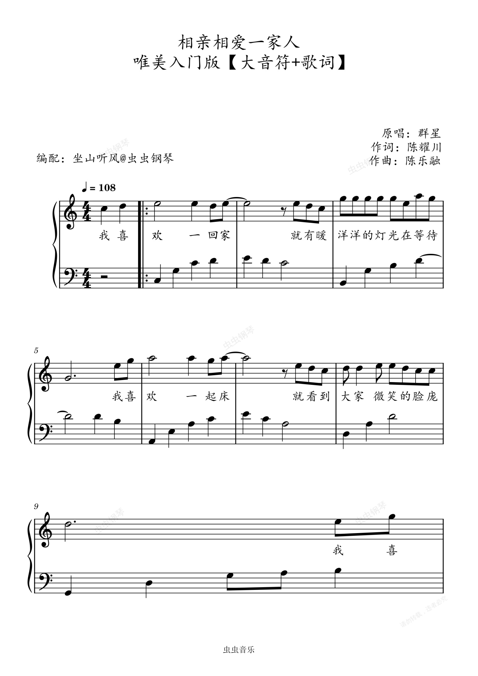 钢琴谱:相亲相爱一家人—— 唯美入门版【大音符+歌词】