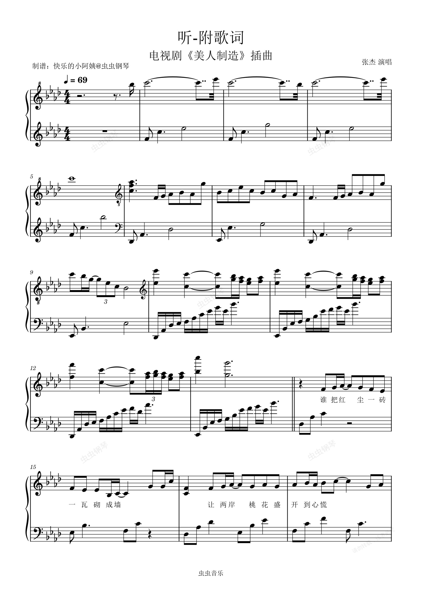 钢琴谱:听-张杰《美人制造》插曲 简易带歌词