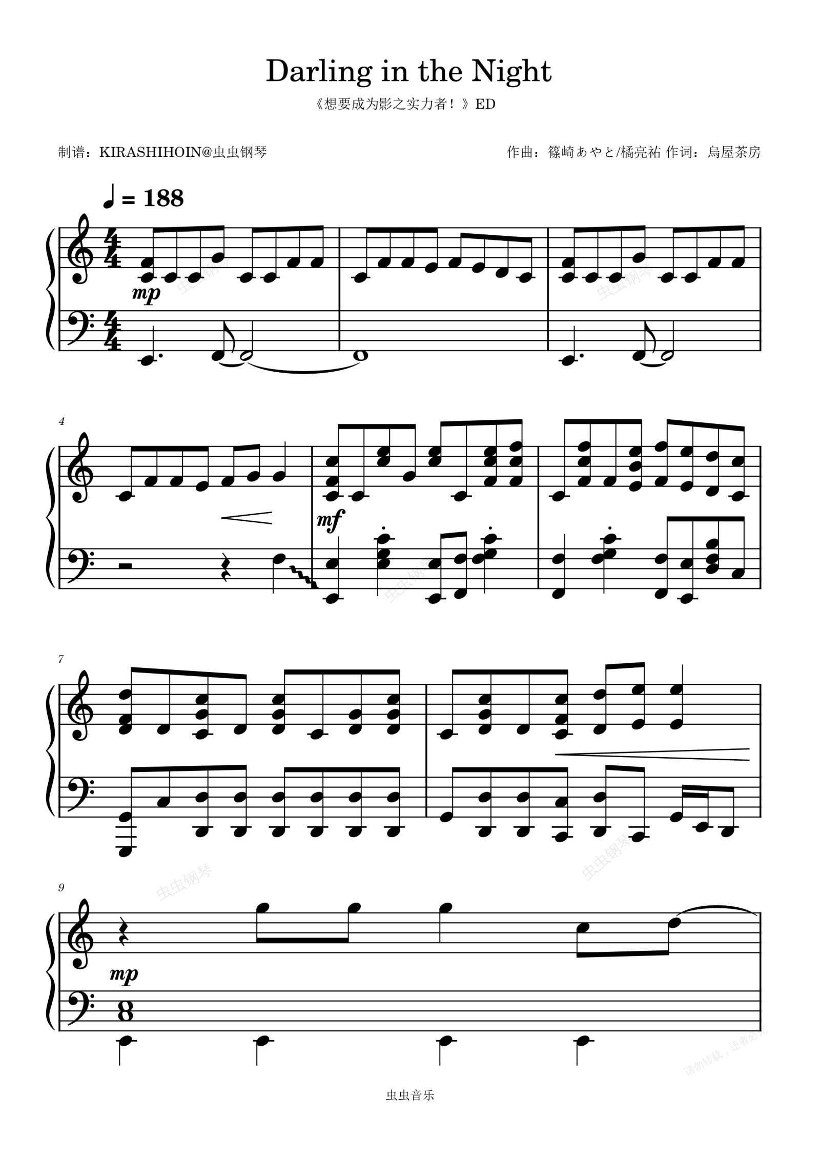钢琴谱:Darling in the Night(《想要成为影之实力者!》ED/片尾曲)- 七陰