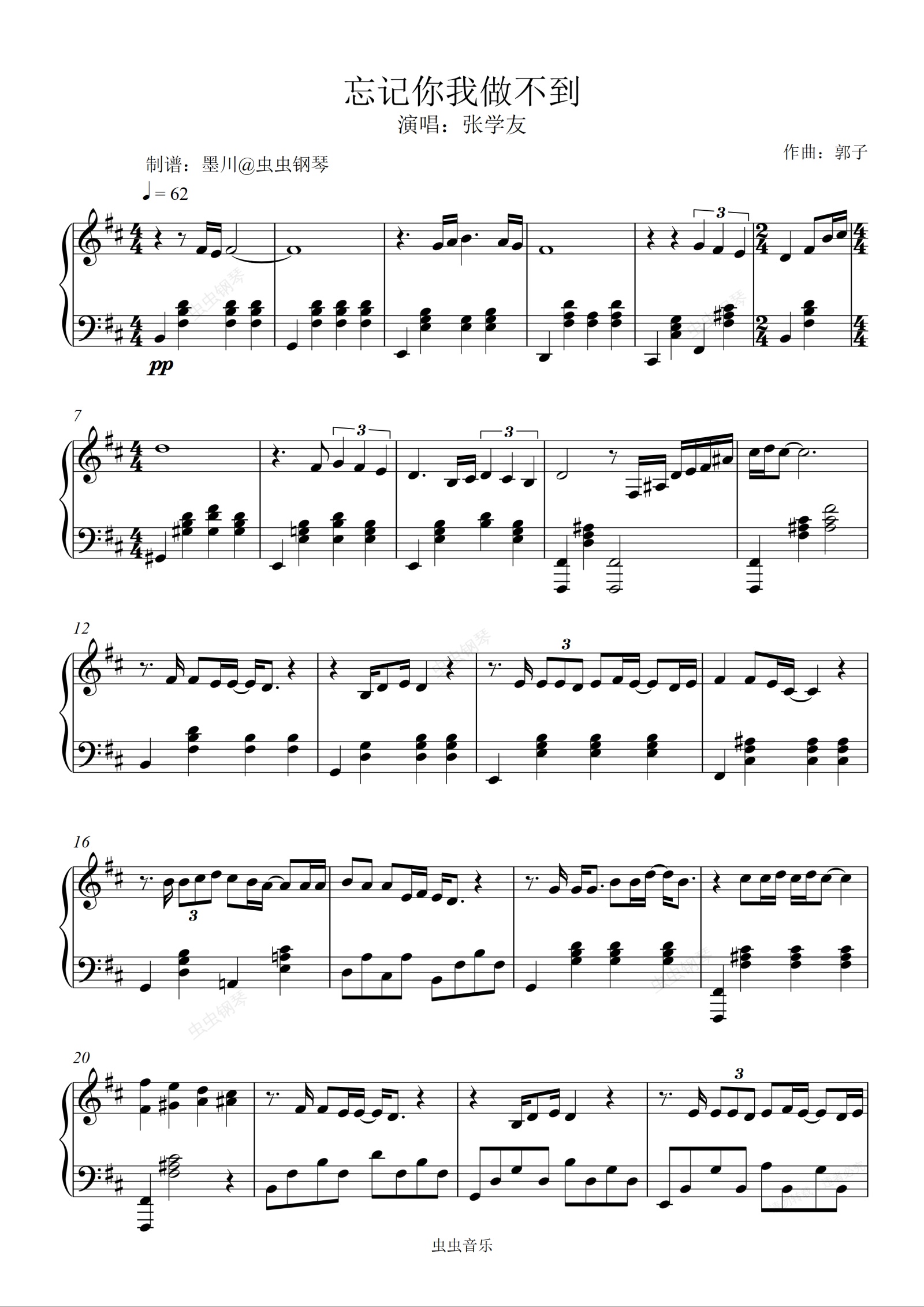 钢琴谱:忘记你我做不到—张学友—原调编配