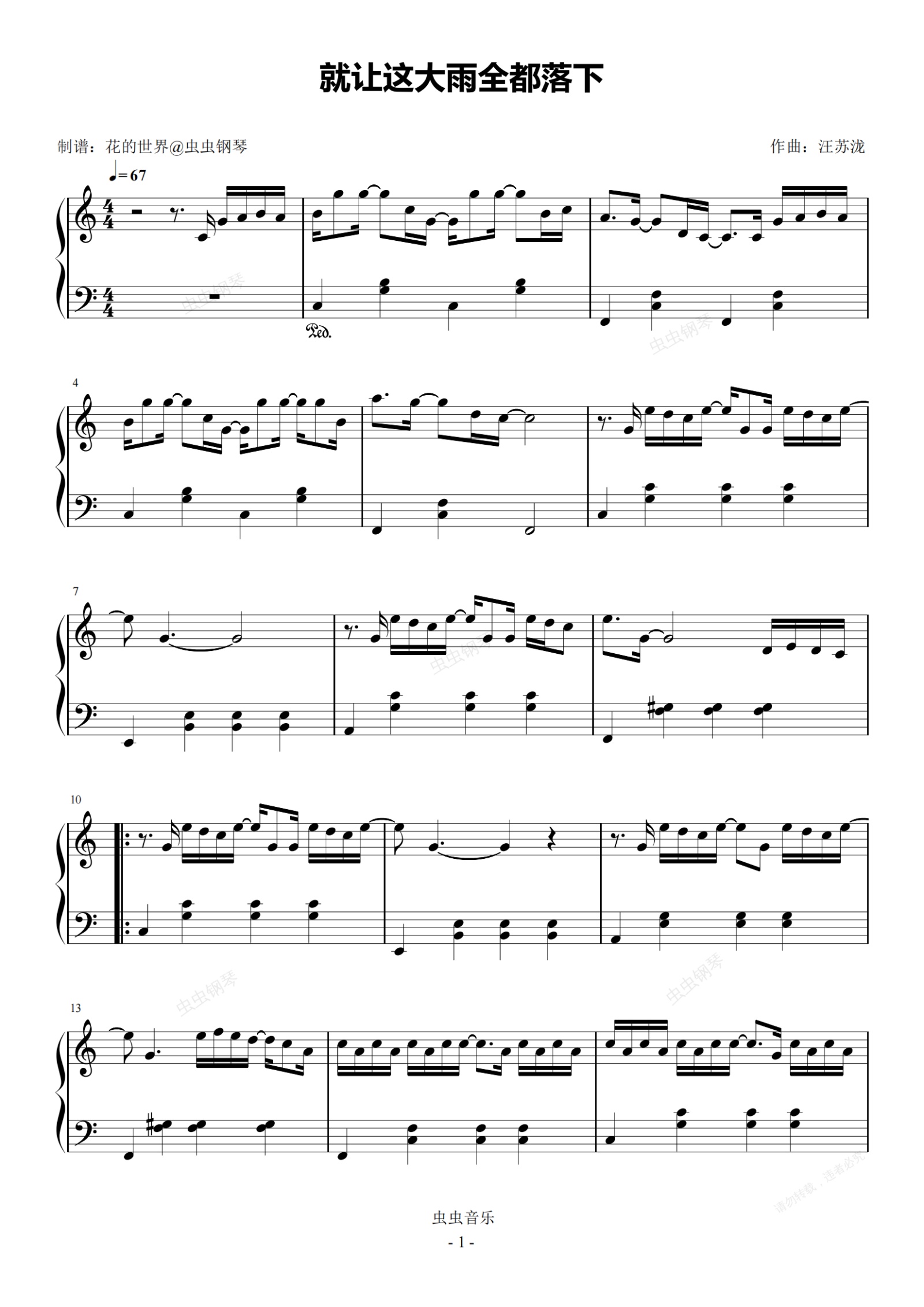 钢琴谱:就让这大雨全都落下 C调简易版 容祖儿 汪苏泷