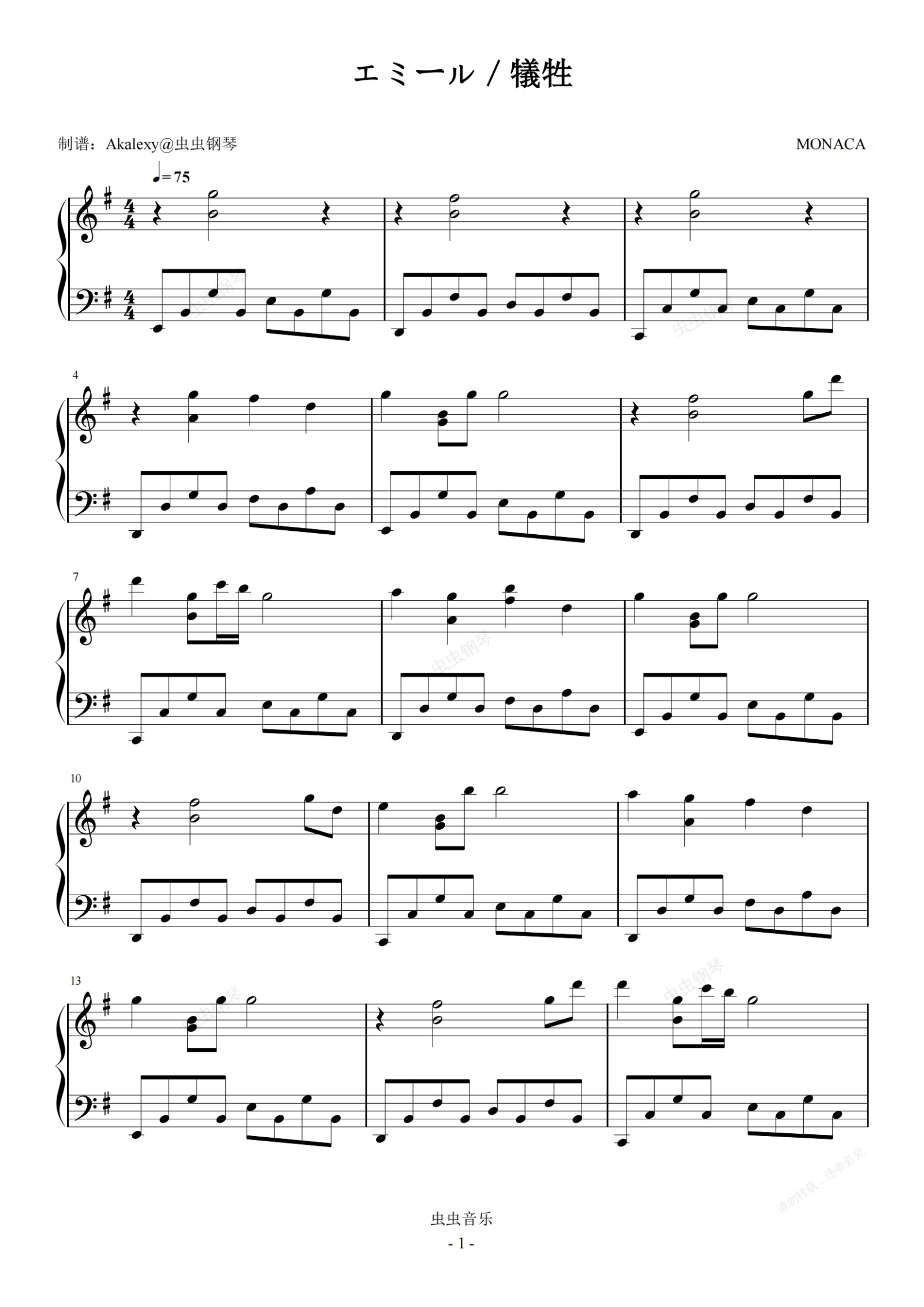 钢琴谱:【尼尔伪装者】エミール/犠牲