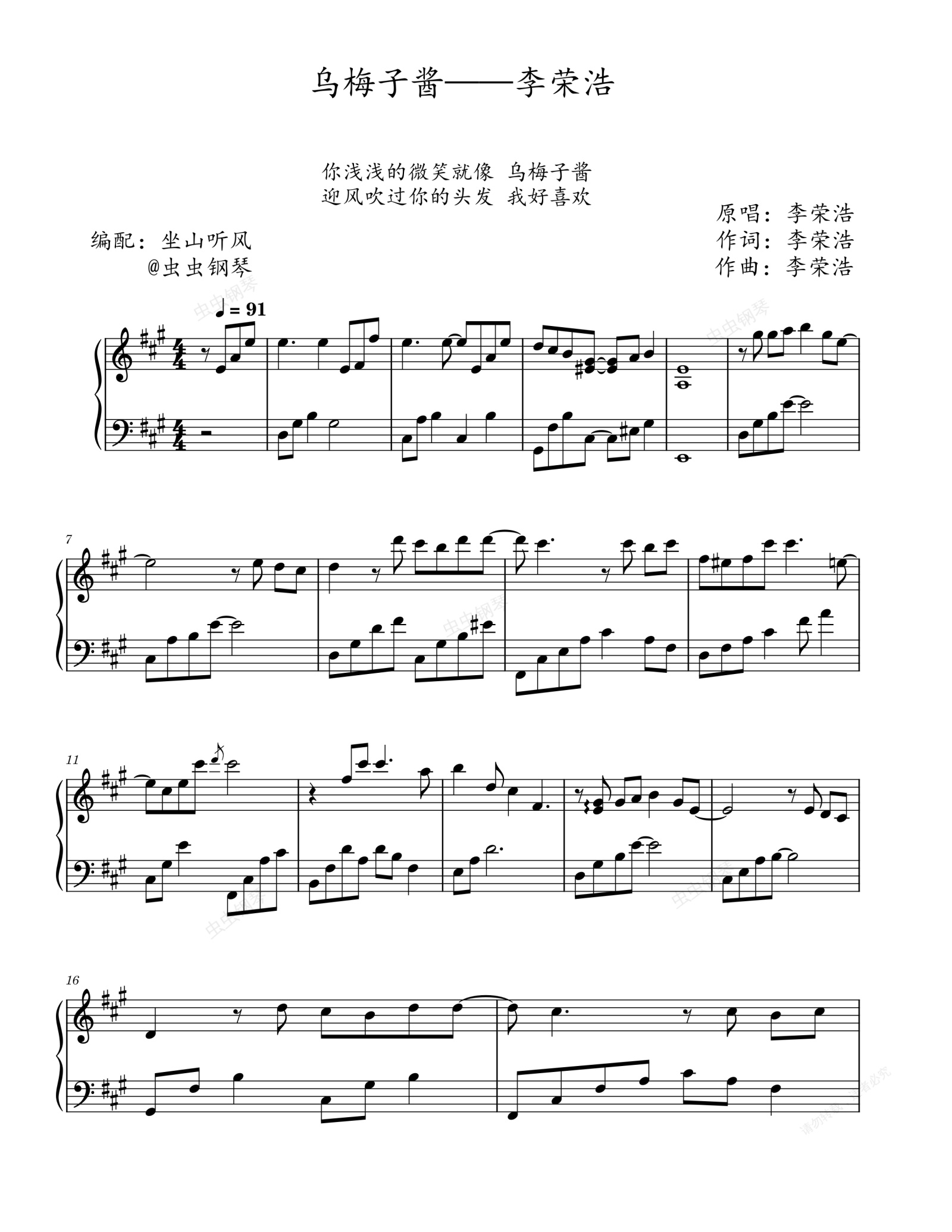钢琴谱:乌梅子酱——李荣浩【抒情】