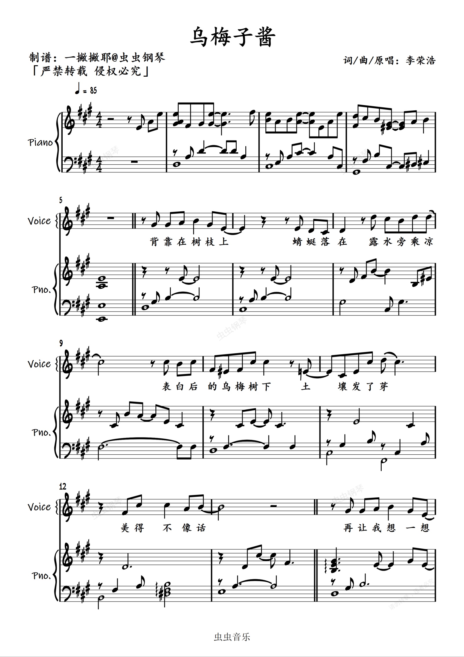 钢琴谱:乌梅子酱【完美弹唱】李荣浩「一撇撇耶」