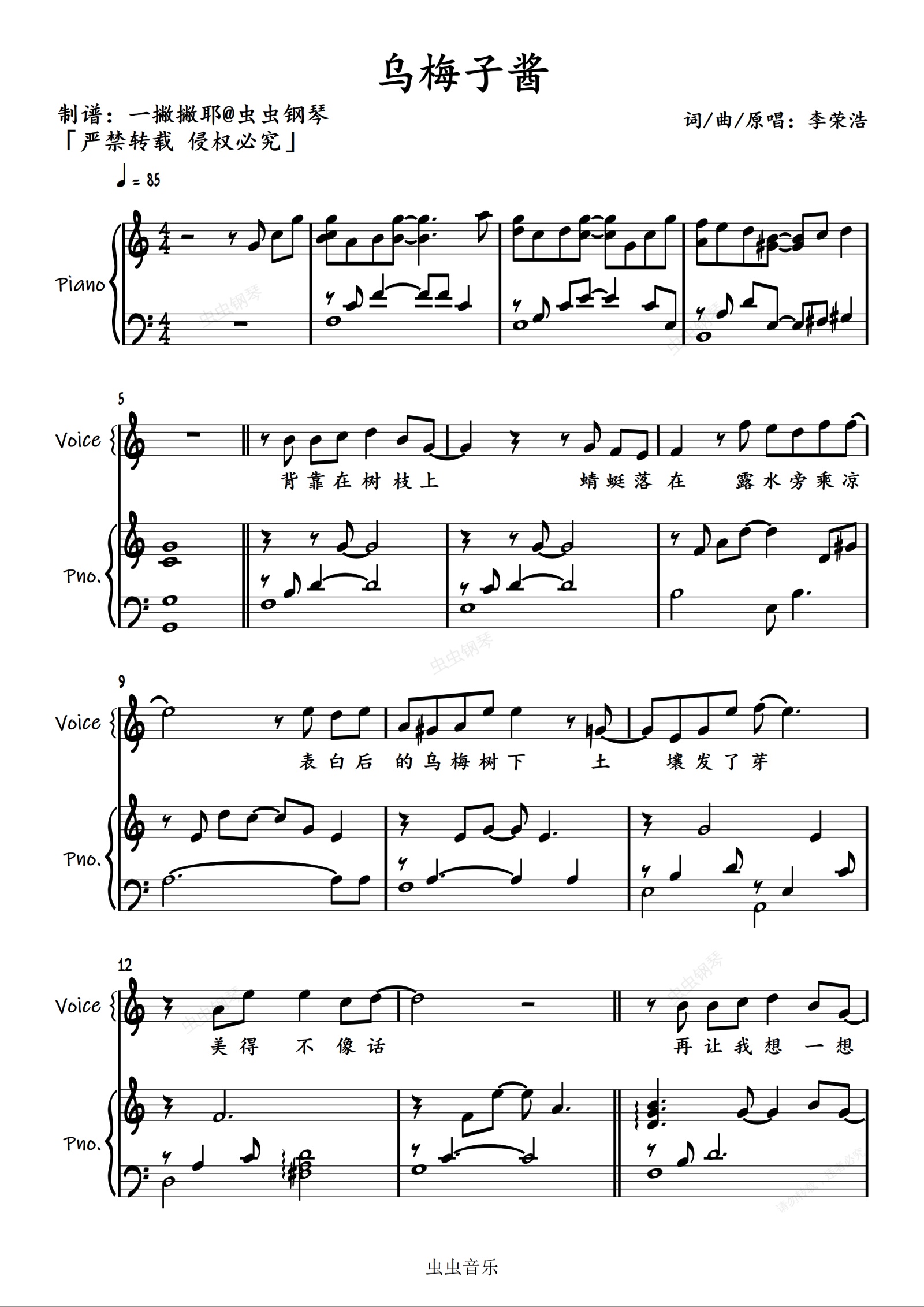 钢琴谱:C调女版弹唱《乌梅子酱》李荣浩「一撇撇耶」