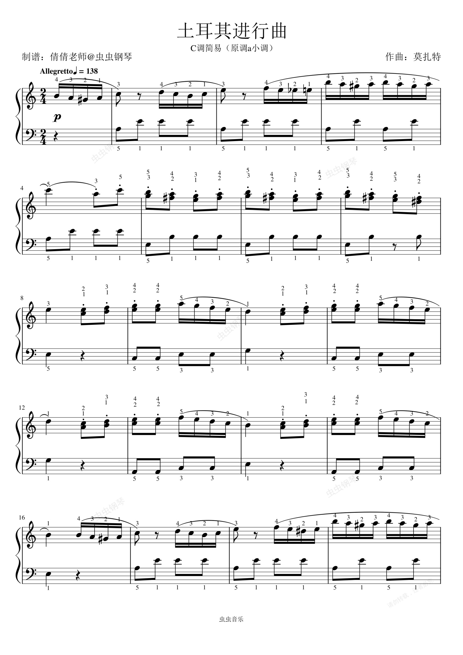 钢琴谱:土耳其进行曲-C调简易-莫扎特