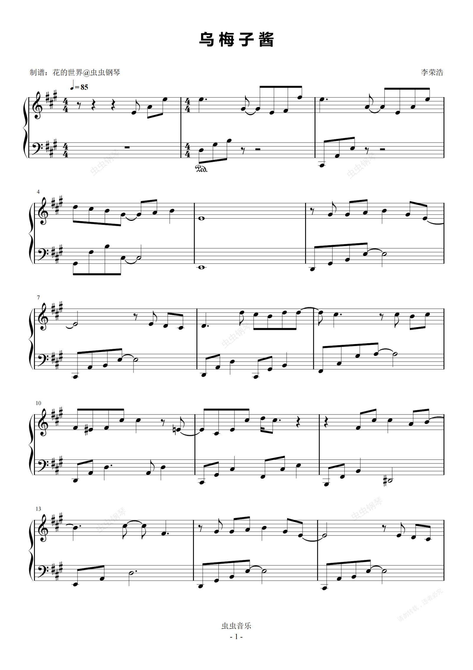 钢琴谱:乌梅子酱 原调简易版 李荣浩