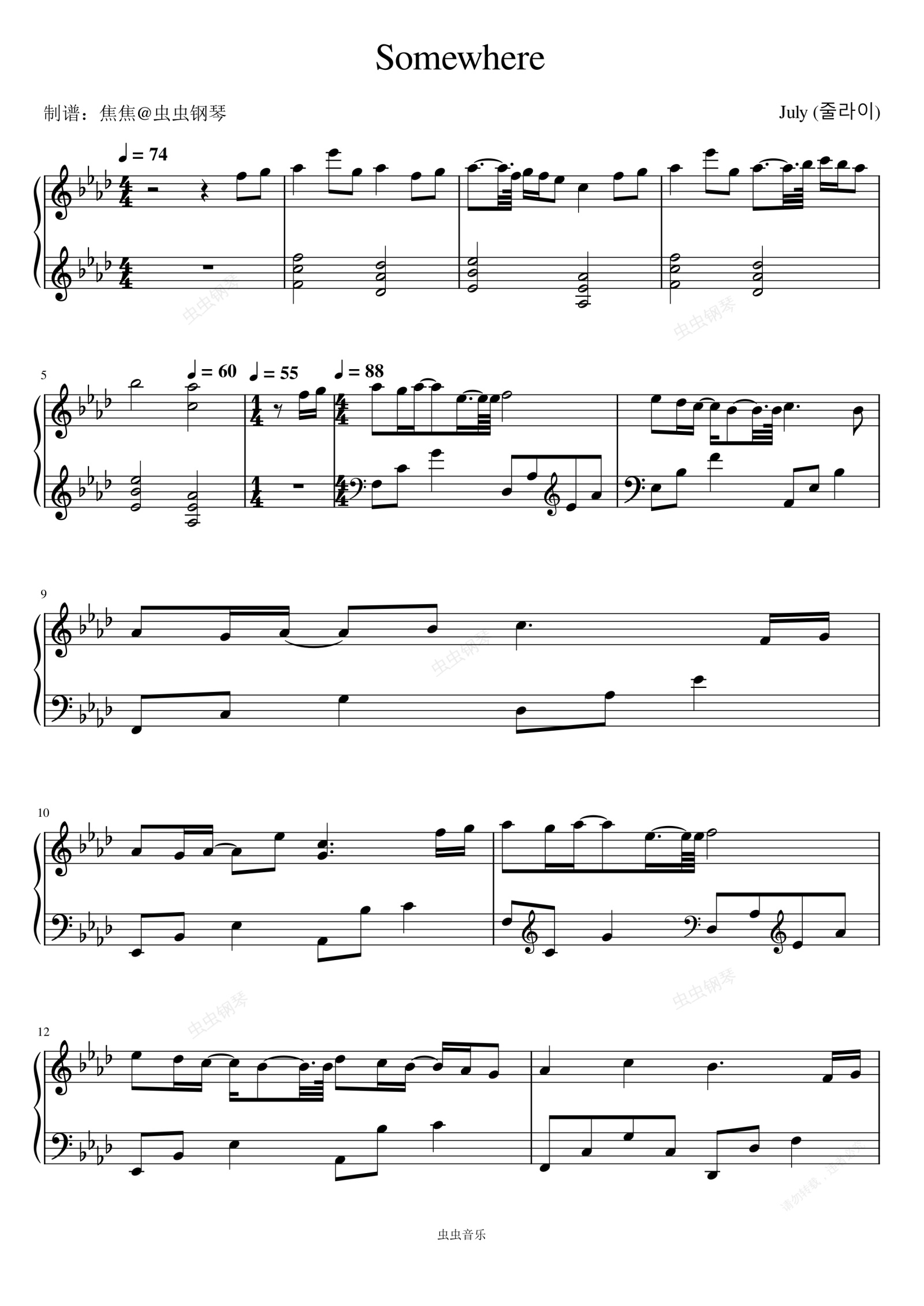 钢琴谱:Somewhere - July (줄라이)