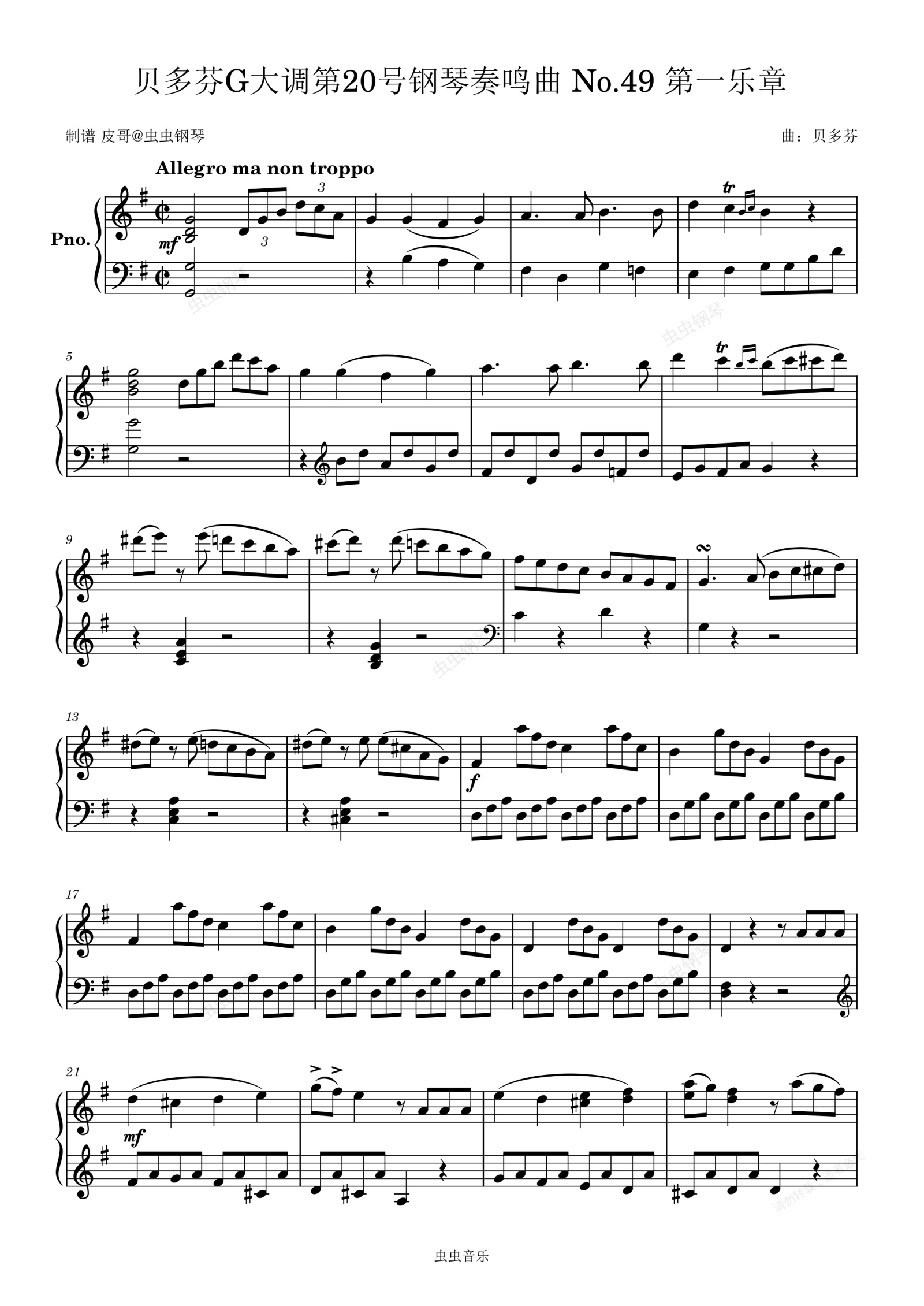 钢琴谱:贝多芬G大调第20号钢琴奏鸣曲 No.49 第一乐章 原版钢琴谱