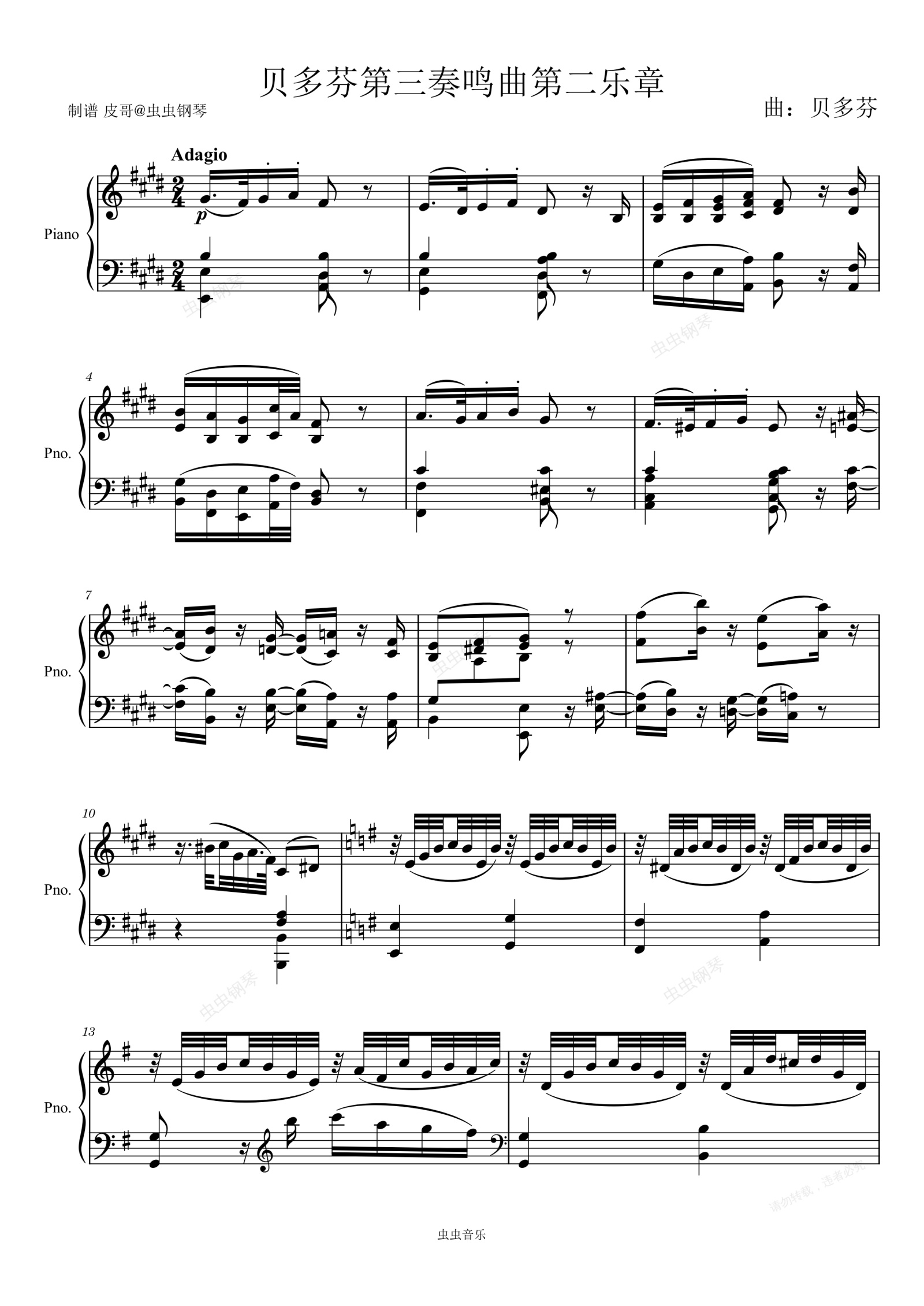 钢琴谱:贝多芬第三奏鸣曲第二乐章 E大调 原版钢琴谱