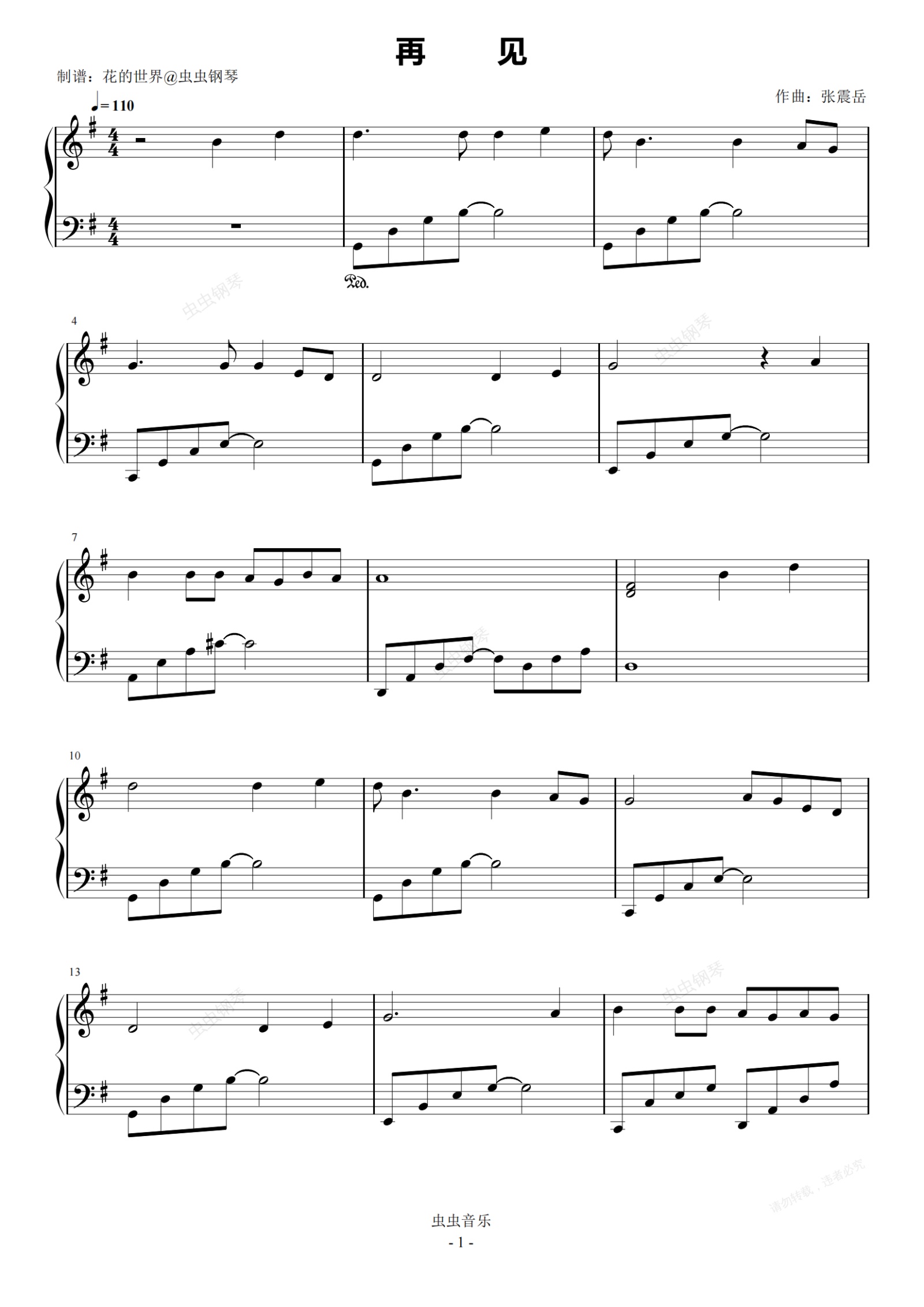 钢琴谱:再见 原调简易版 张震岳