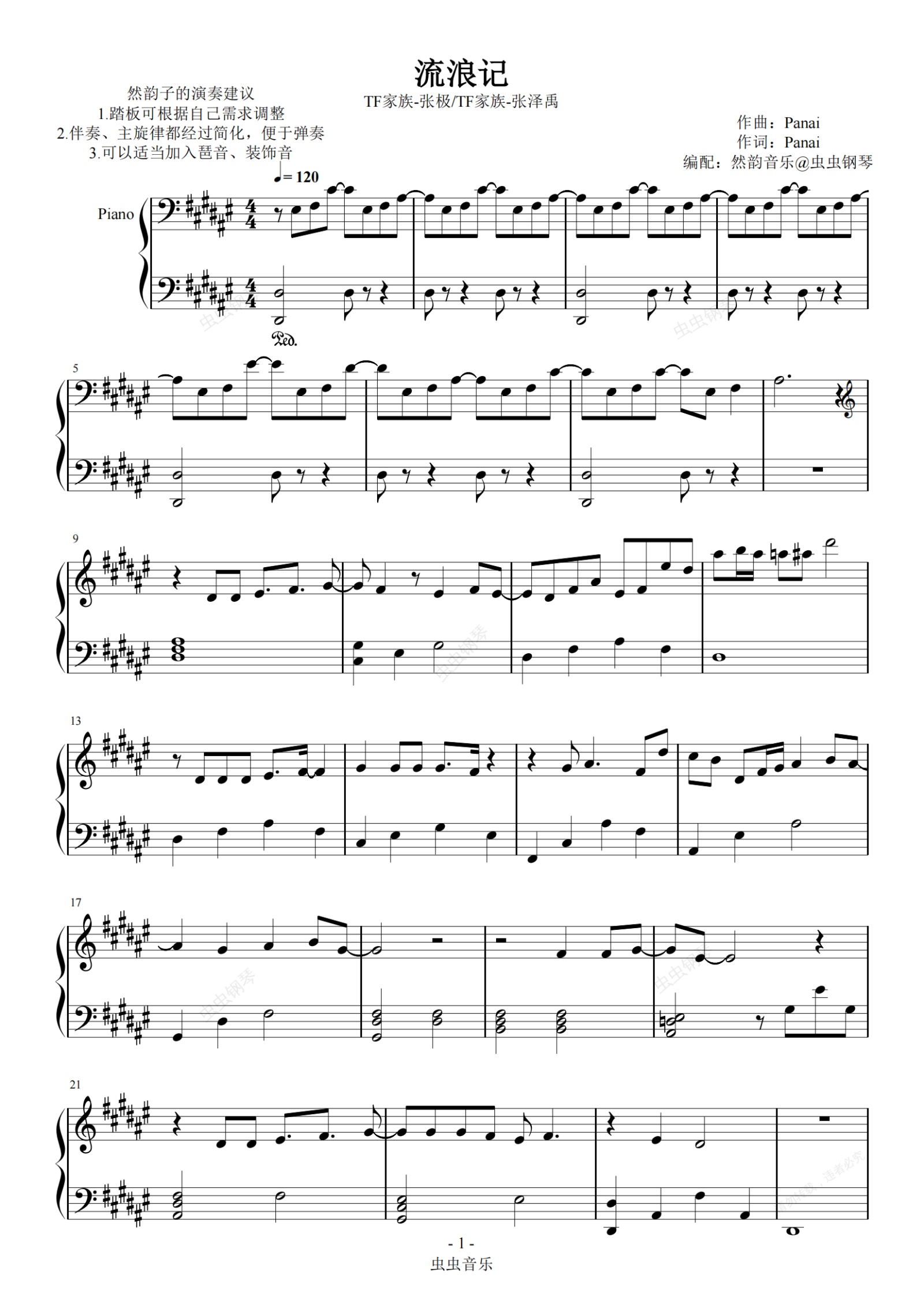 钢琴谱:【原调】流浪记-TF家族张极/张泽禹 钢琴简单易学