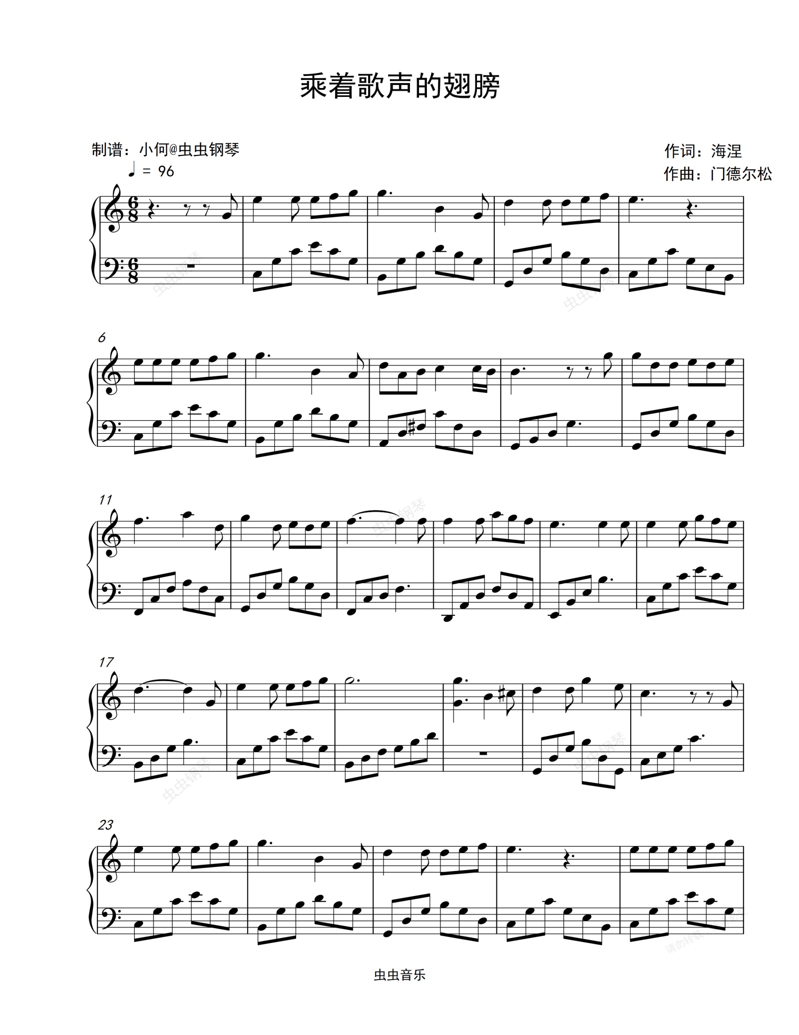 钢琴谱:乘着歌声的翅膀-On wings of song-门德尔松