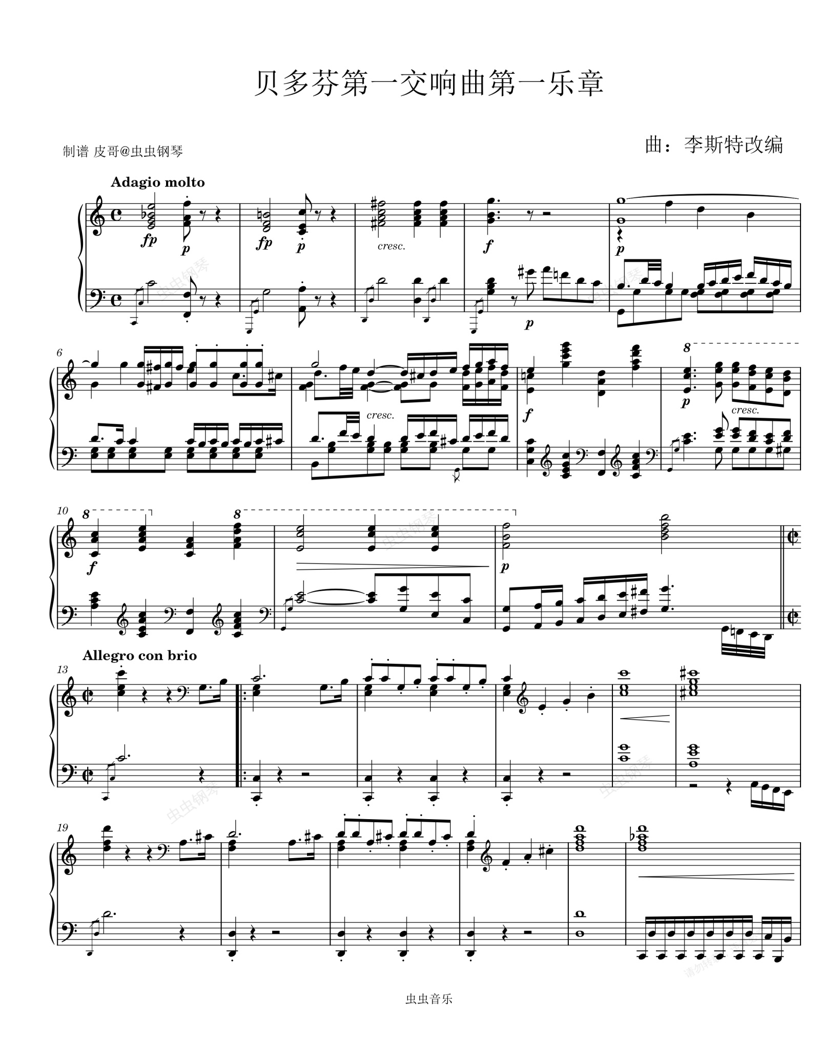 钢琴谱:贝多芬第一交响曲第一乐章  C大调 原版钢琴谱