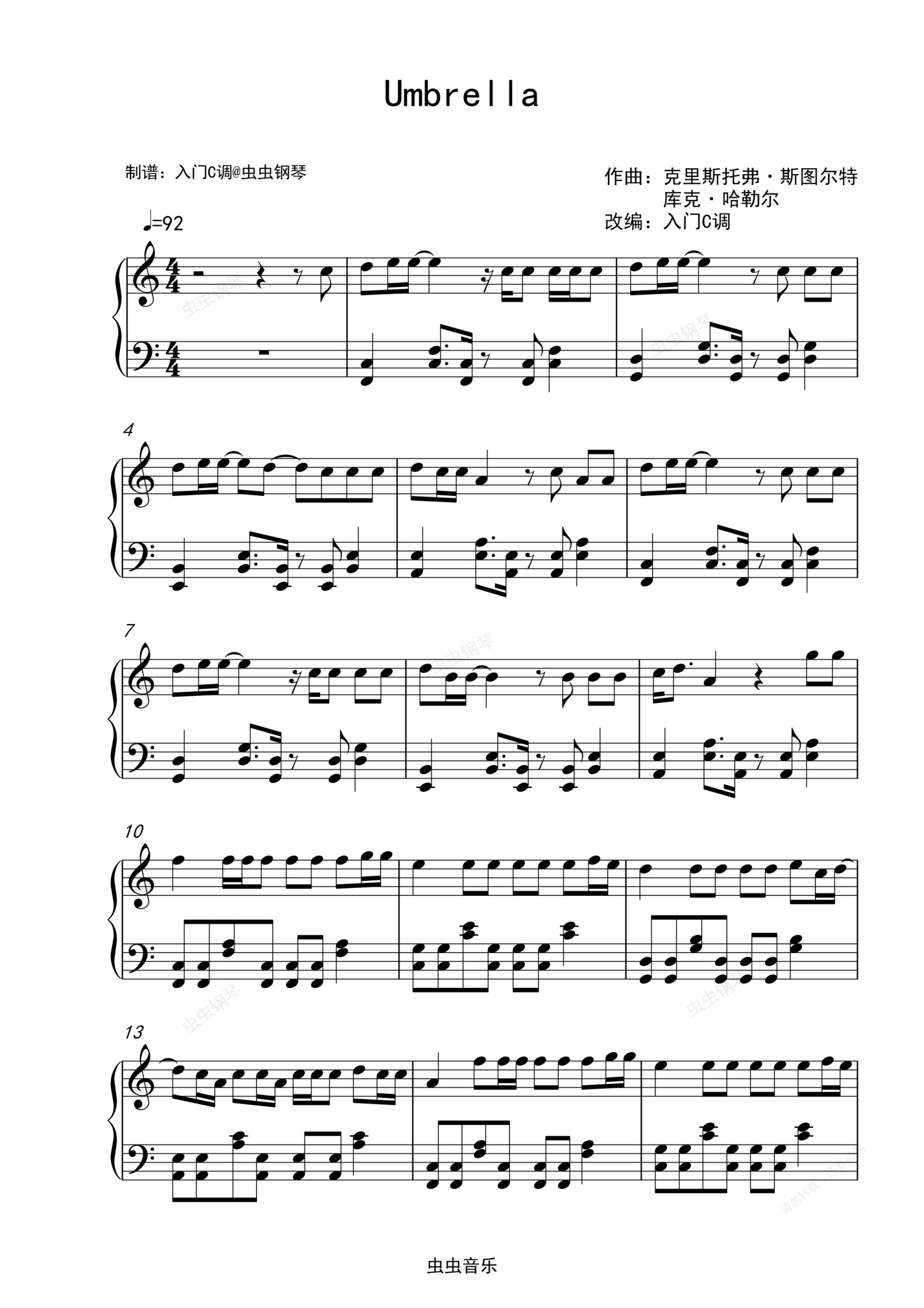 钢琴谱:蕾哈娜《Umbrella》入门C调简单版