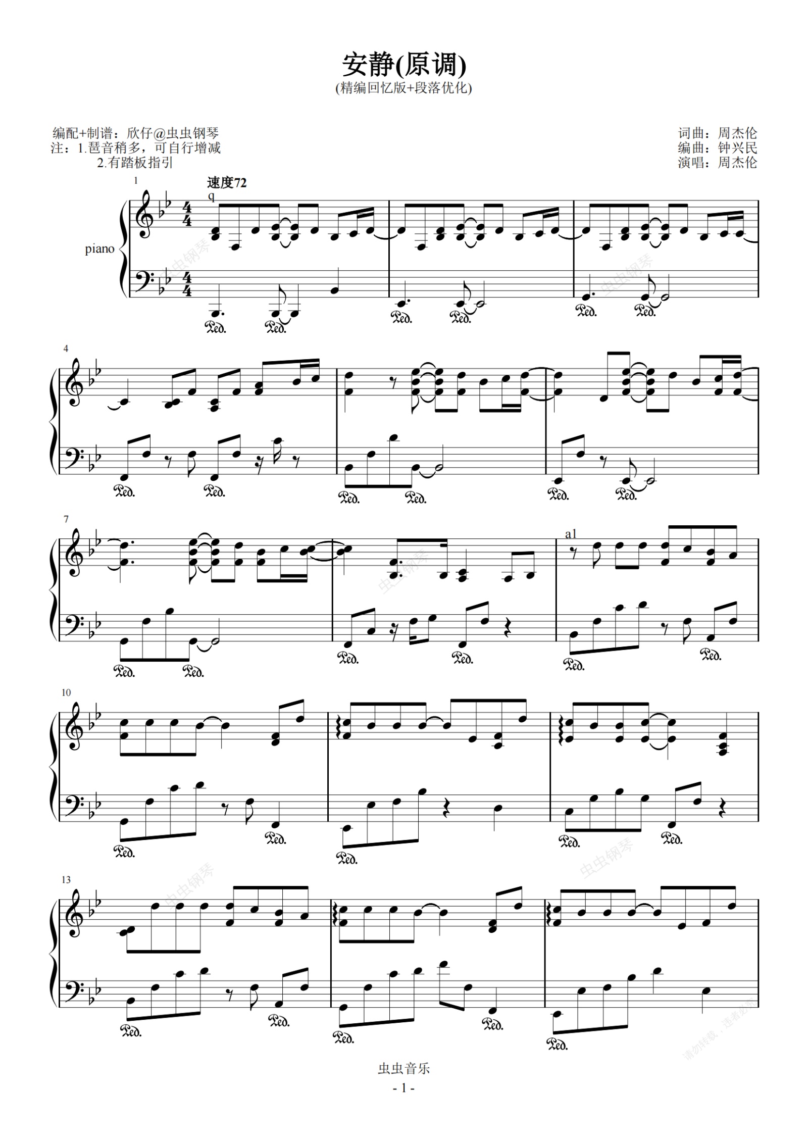 钢琴谱:周杰伦-降B《安静》(精编回忆版+段落优化)