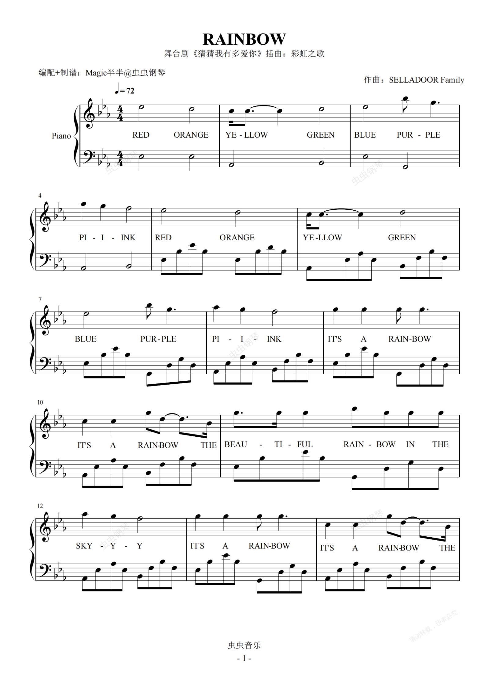 钢琴谱:彩虹之歌 舞台剧<猜猜我有多爱你>插曲