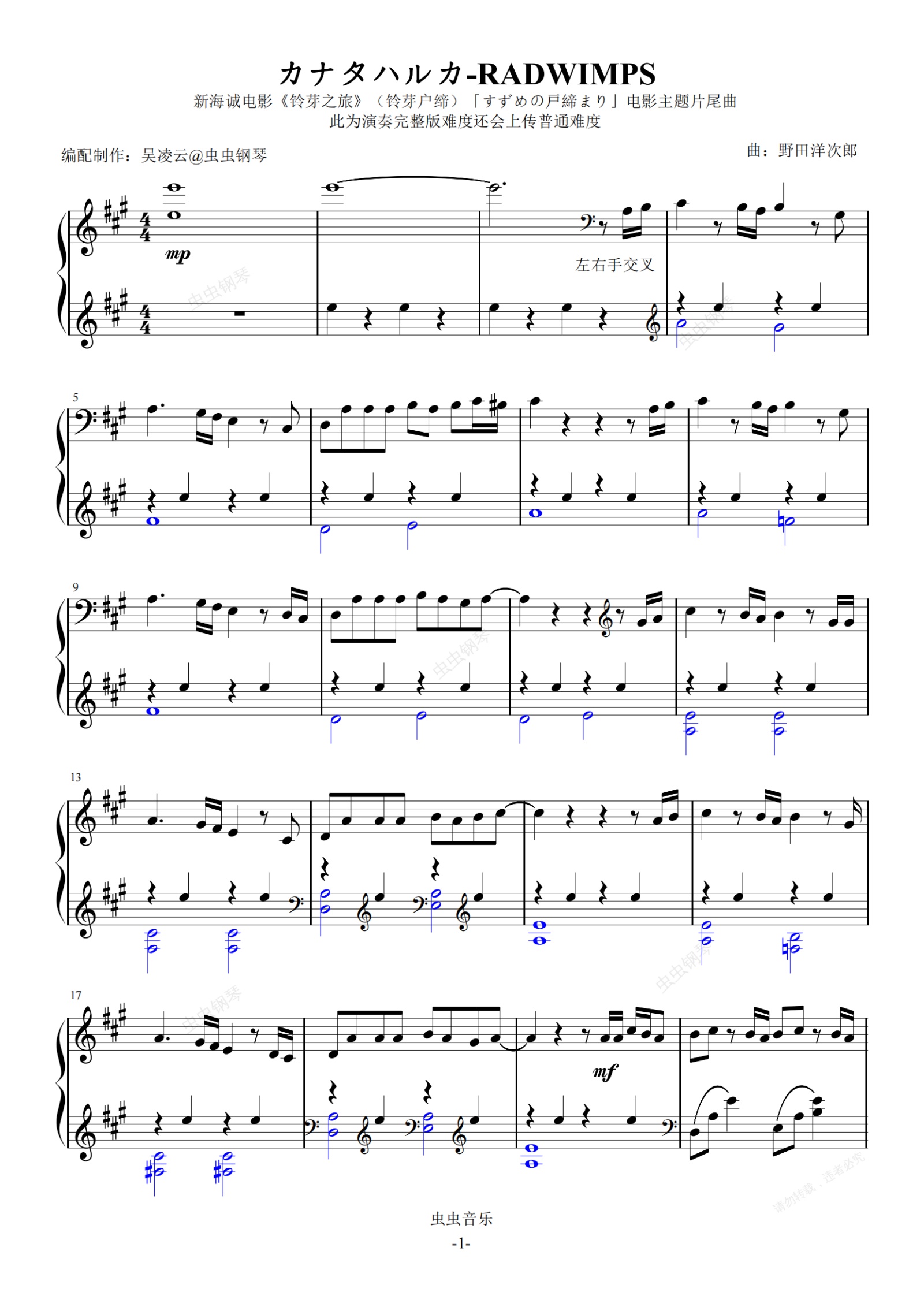 钢琴谱:カナタハルカ-RADWIMPS 新海诚电影《铃芽之旅》(铃芽户缔)「すずめの戸締まり」电影主题片尾曲