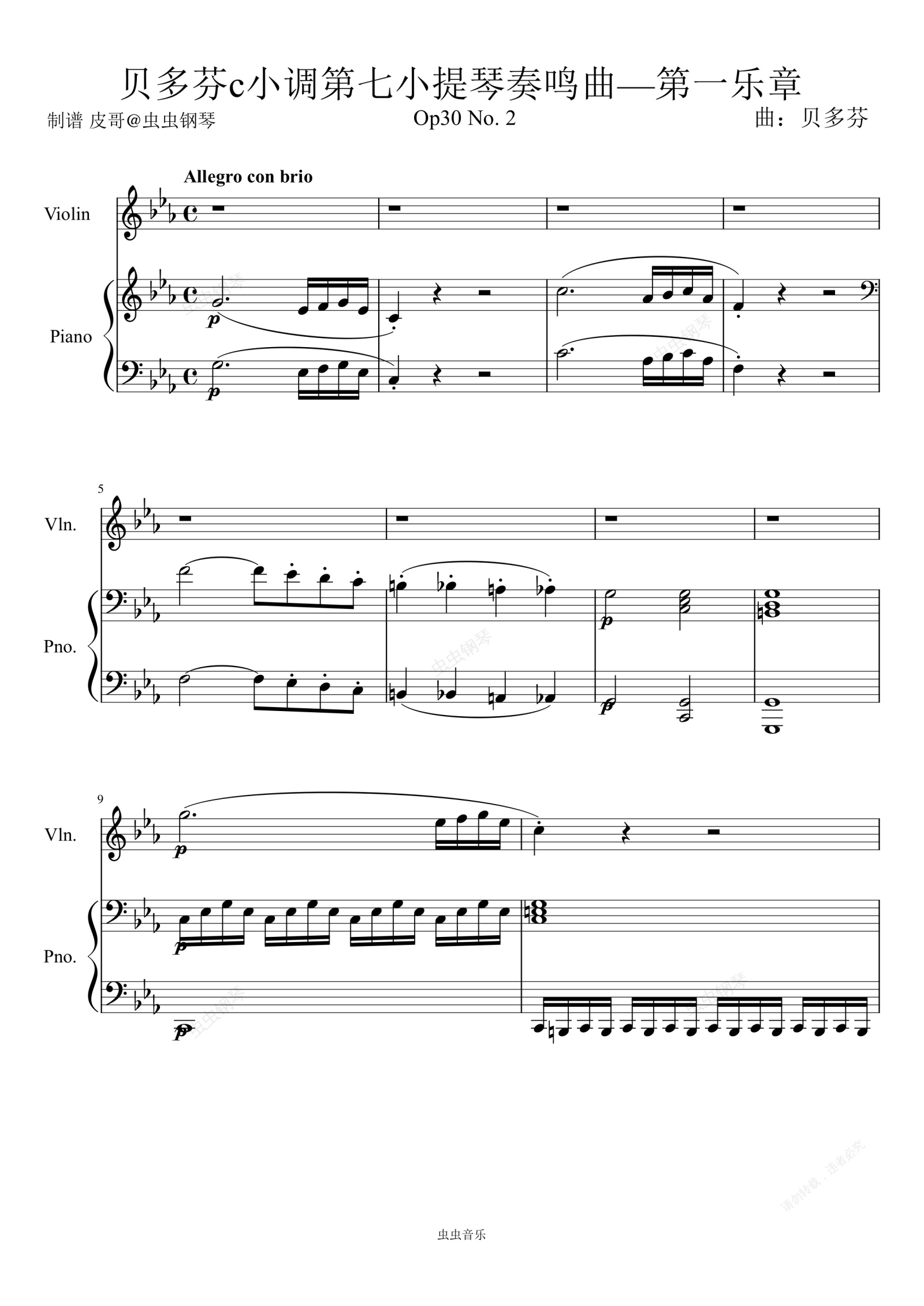 钢琴谱:贝多芬c小调第七小提琴奏鸣曲—第一乐章 降E大调 原版钢琴谱