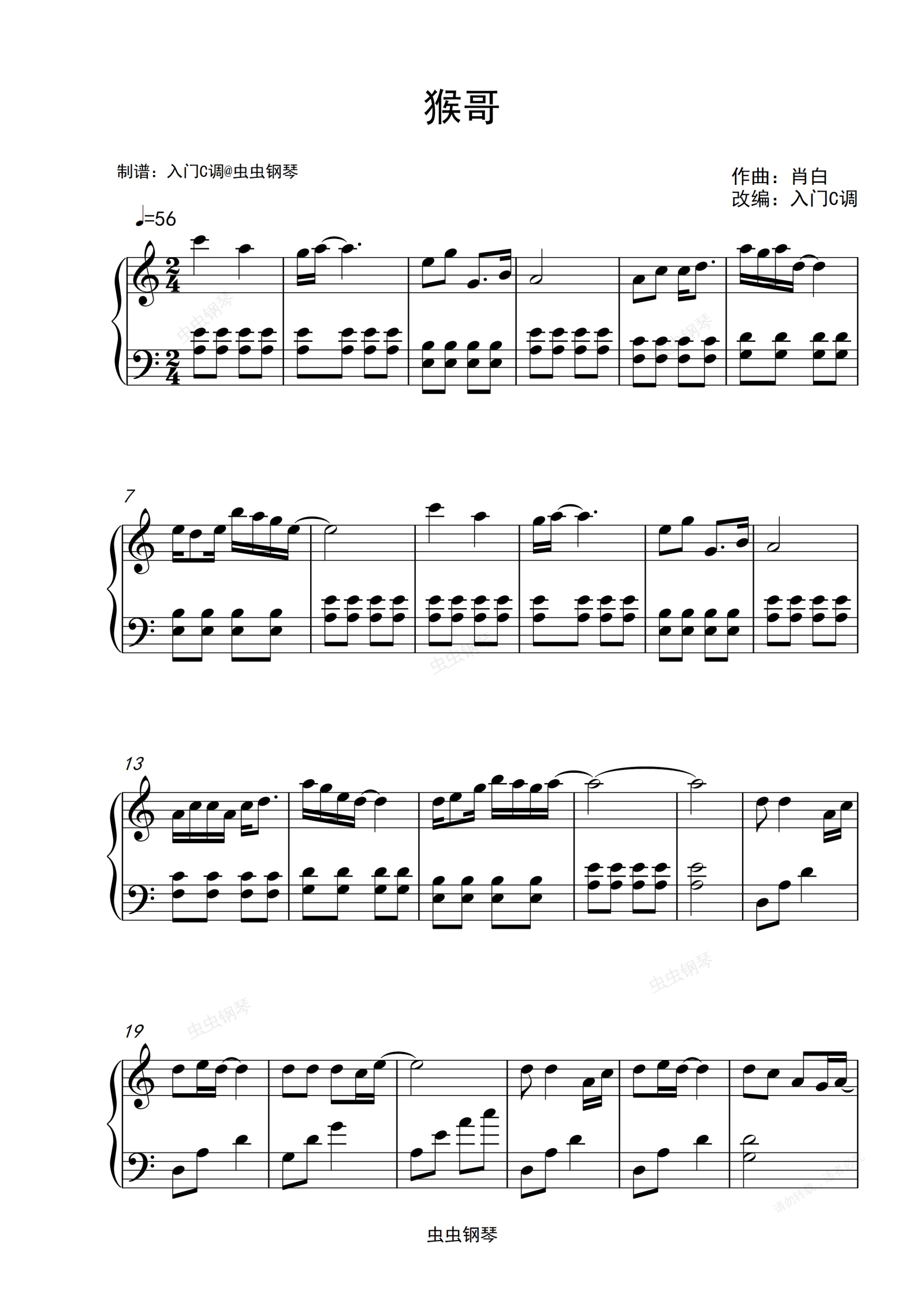 钢琴谱:《西游记》动画片主题曲《猴哥》入门C调简单版