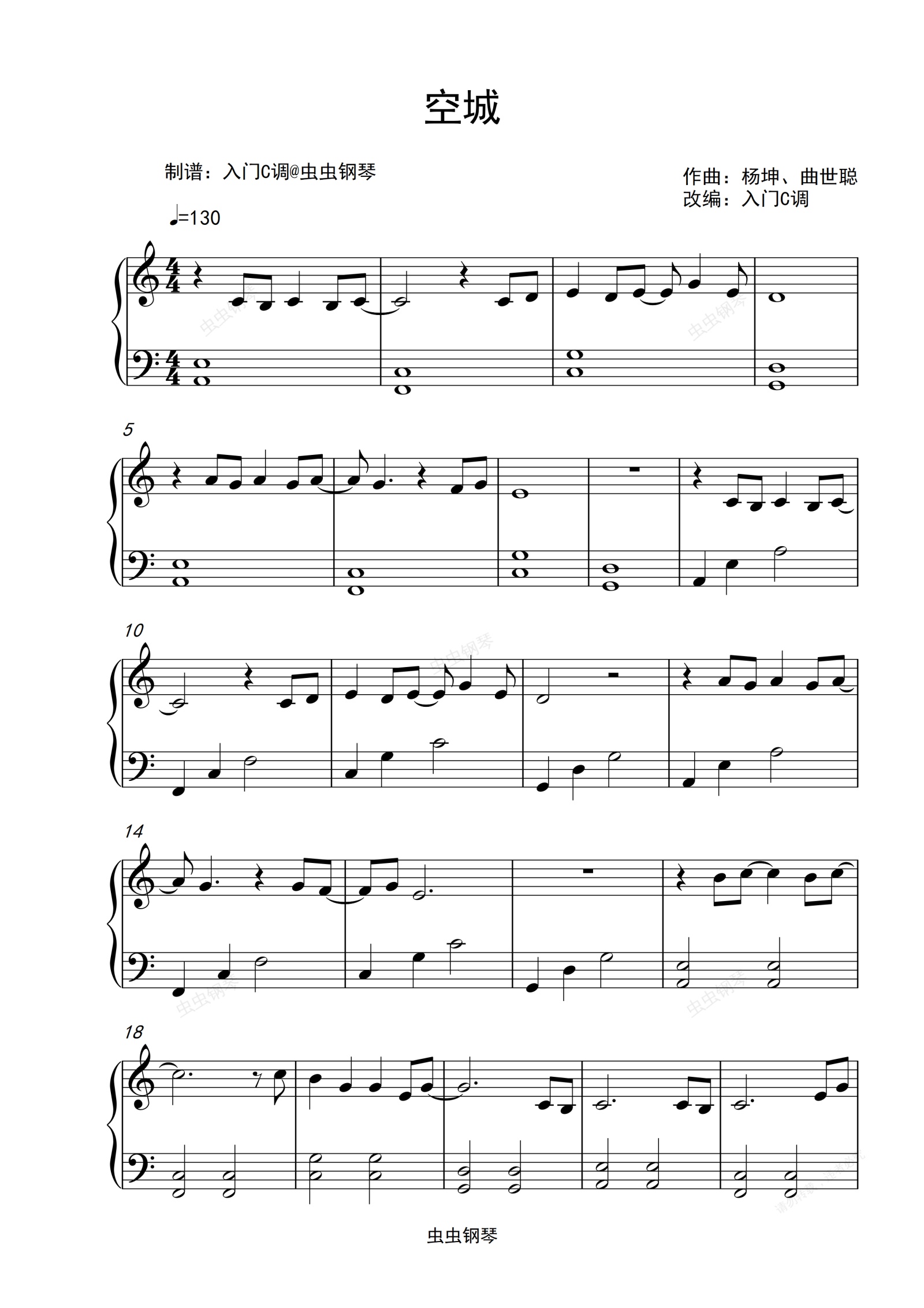 钢琴谱:杨坤《空城》入门C调简单抒情版