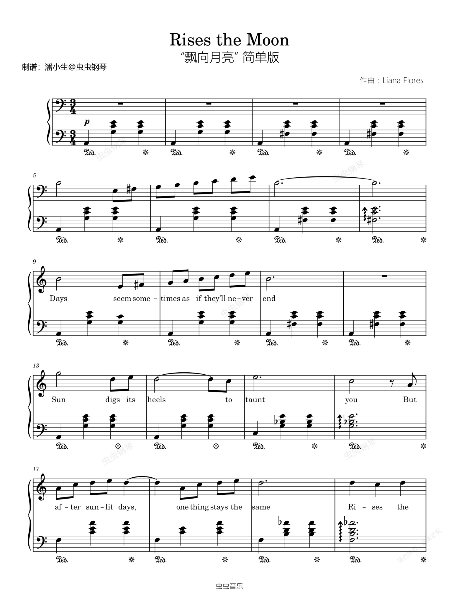 钢琴谱:Rises the Moon 飘向月亮 简单版 带歌词