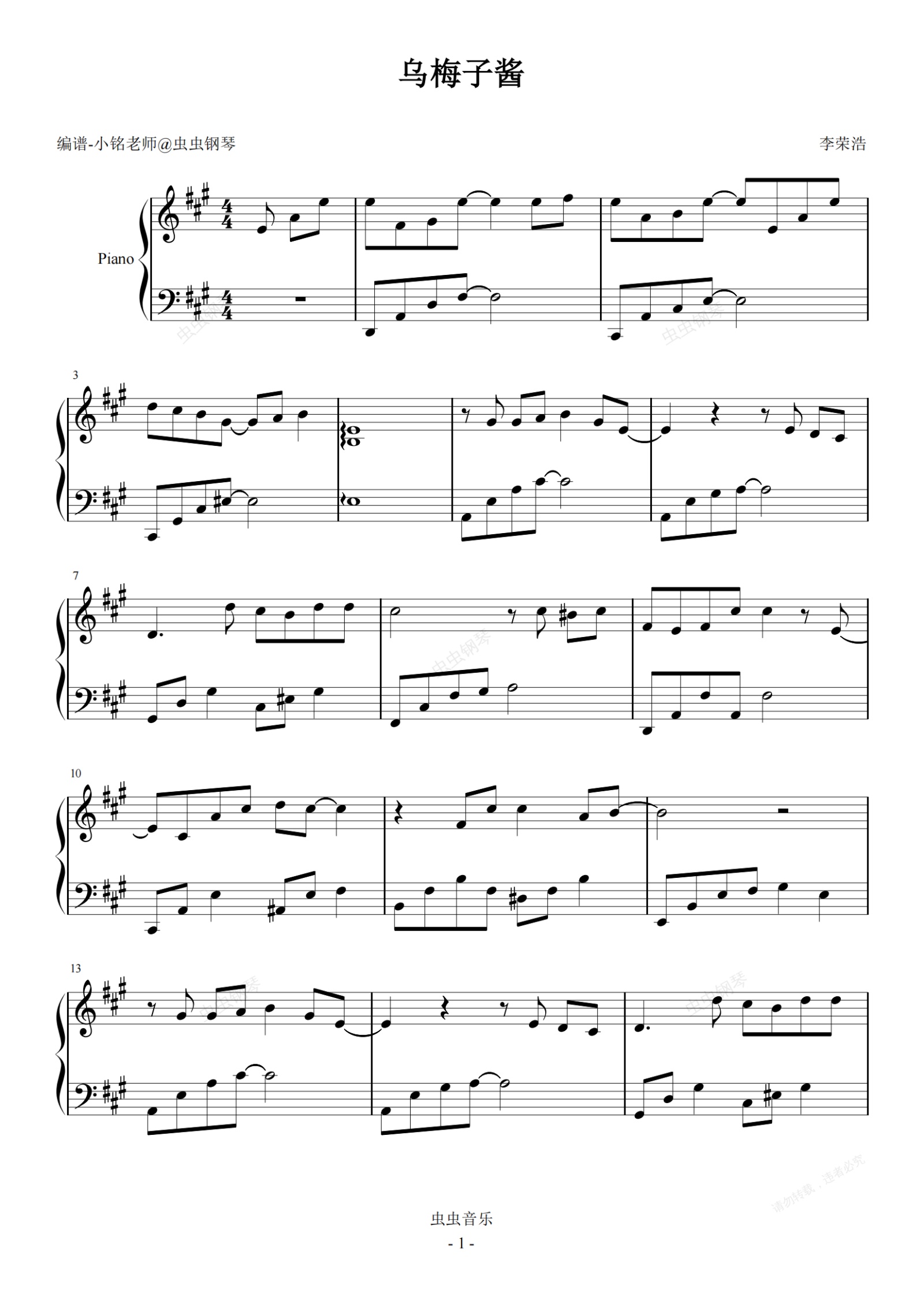 钢琴谱:乌梅子酱【原调 简易】