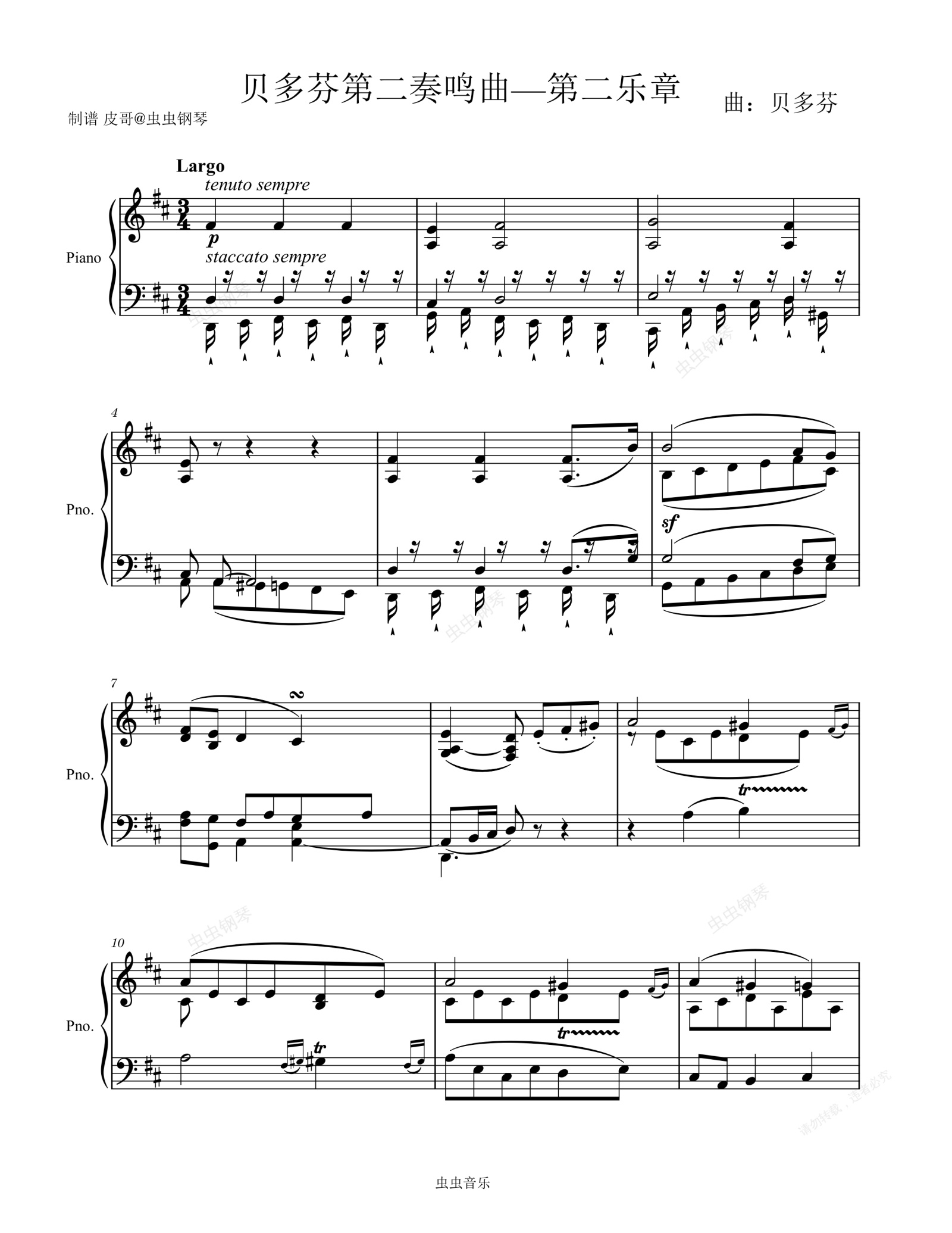 钢琴谱:贝多芬第二奏鸣曲—第二乐章 D大调 原版钢琴谱