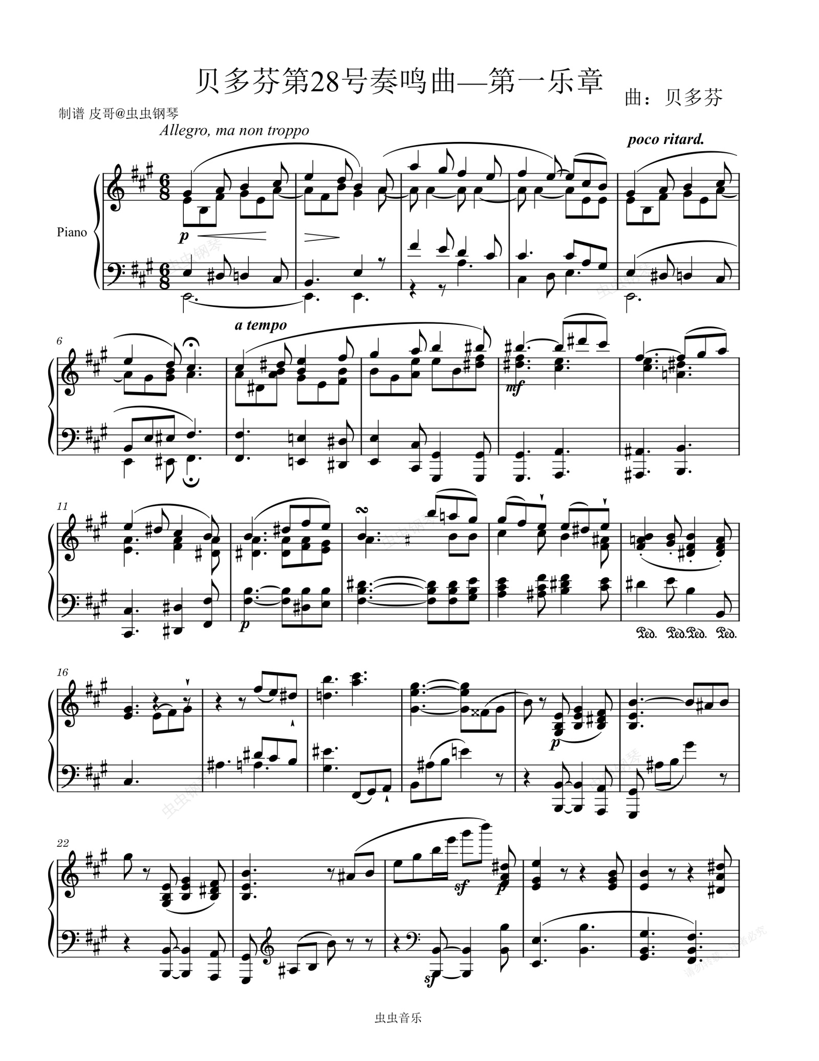 钢琴谱:贝多芬第28号奏鸣曲—第一乐章 A大调 原版钢琴谱