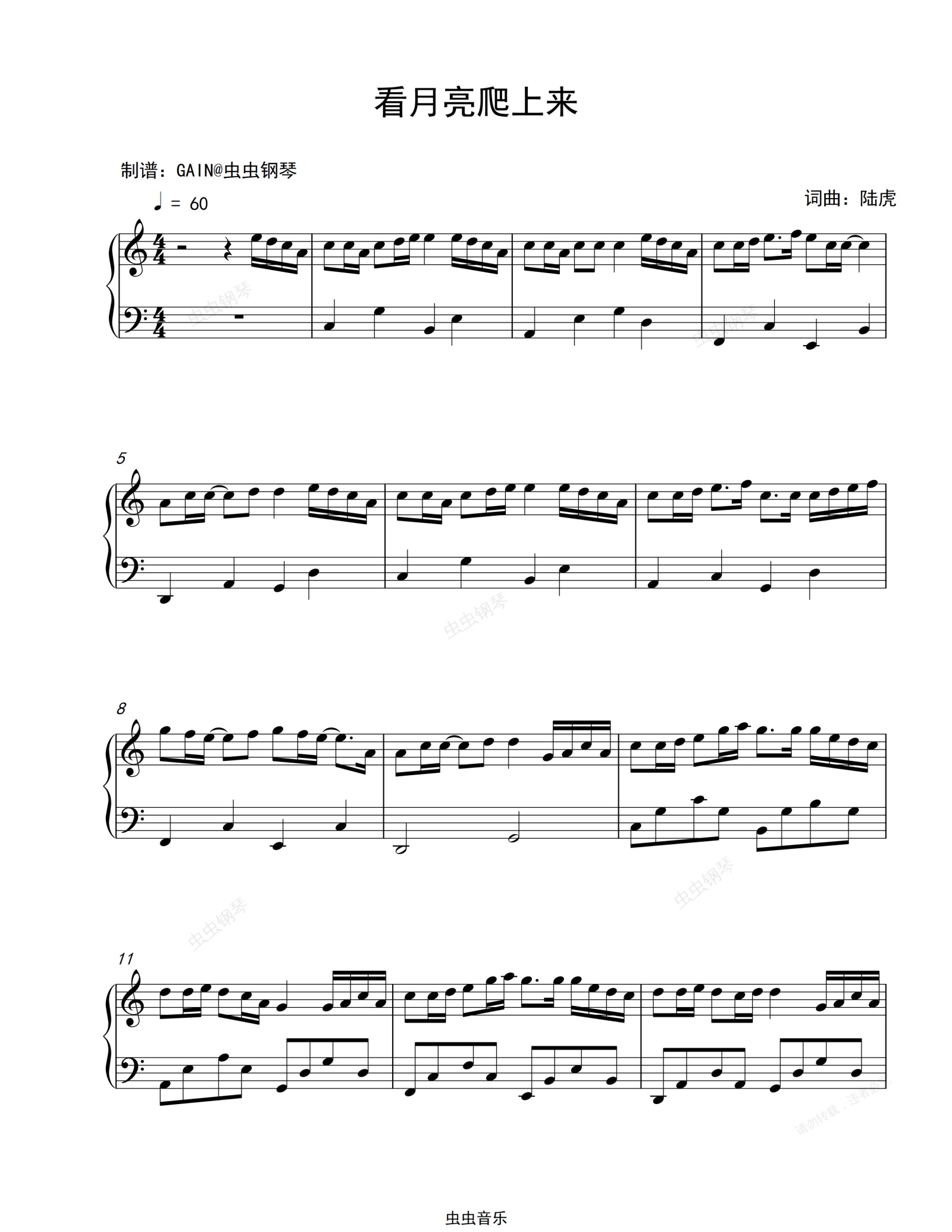 钢琴谱:看月亮爬上来-C调简单版-张杰