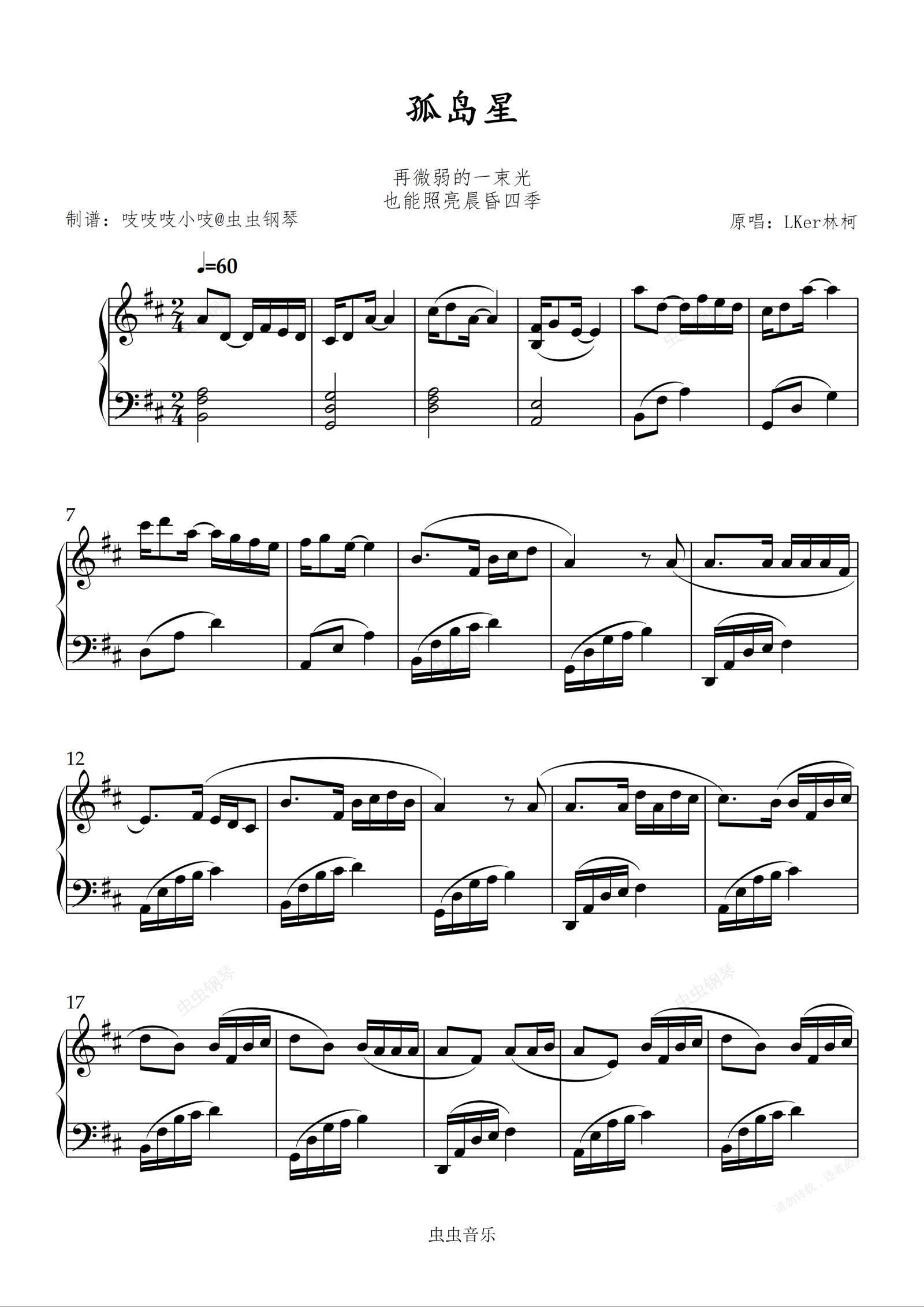 钢琴谱:孤岛星-D 【初级难度】 吱吱编配