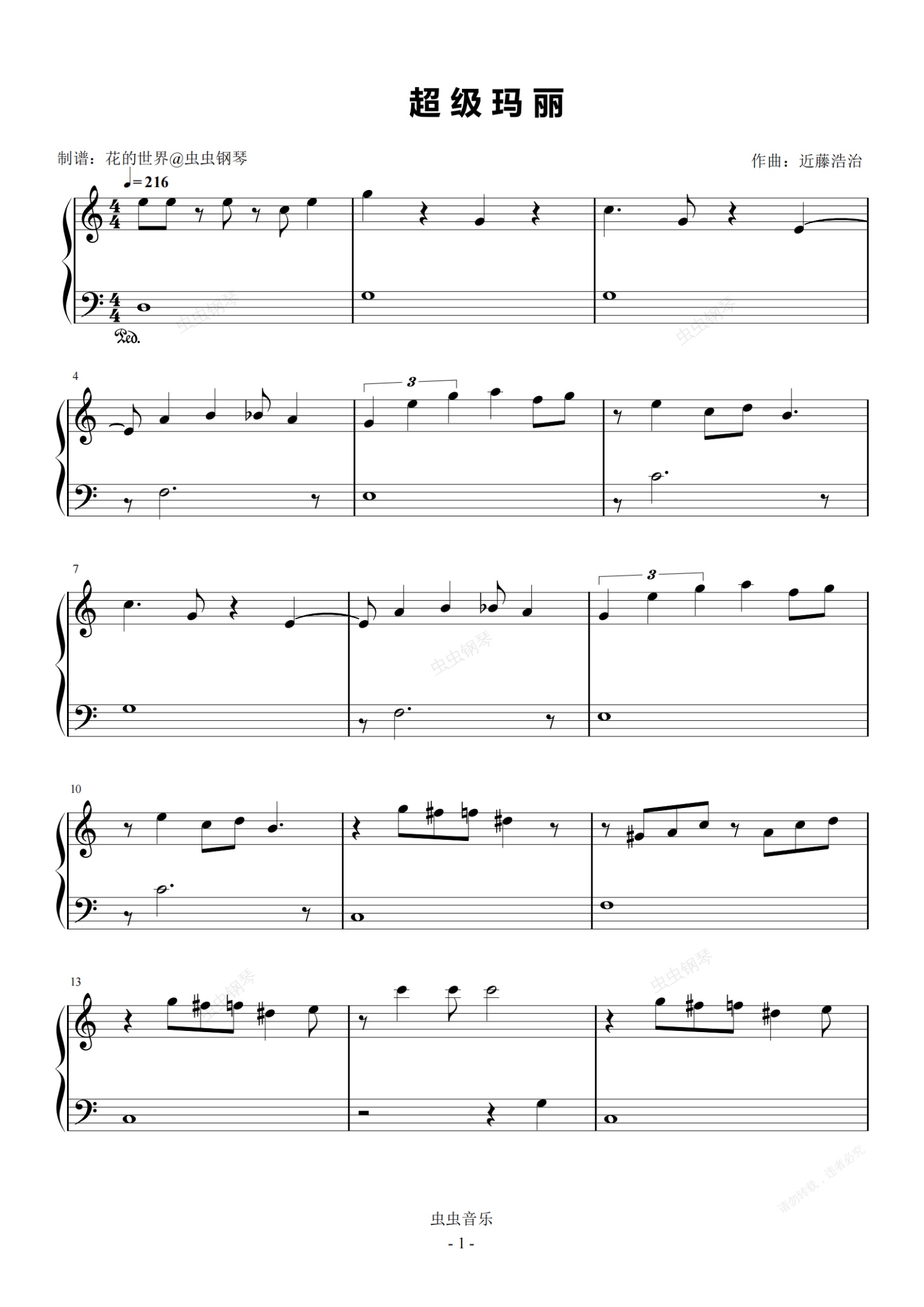 钢琴谱:超级玛丽 游戏主题曲The Super Mario C调简易版本 容易弹