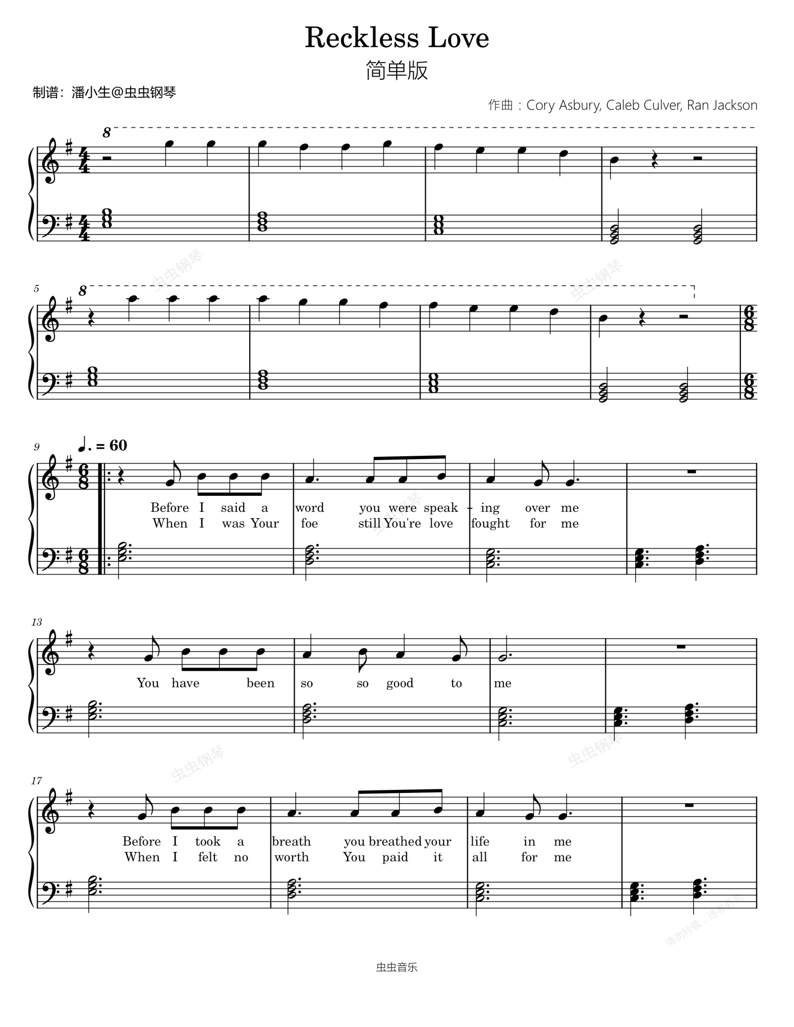 钢琴谱:Reckless Love 简单版独奏谱 带歌词  Cory Asbury