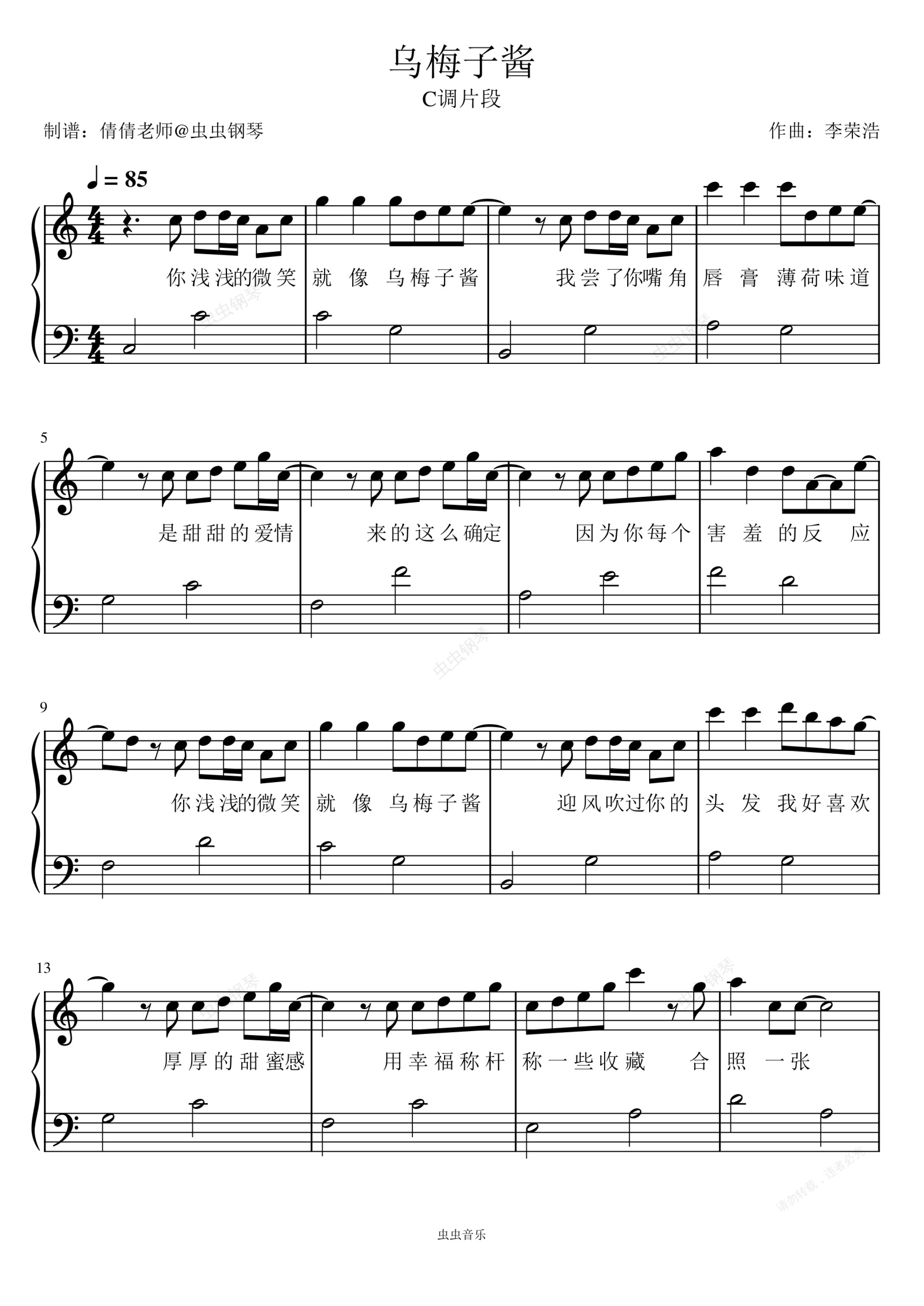 钢琴谱:乌梅子酱-C调片段-初学简易-李荣浩