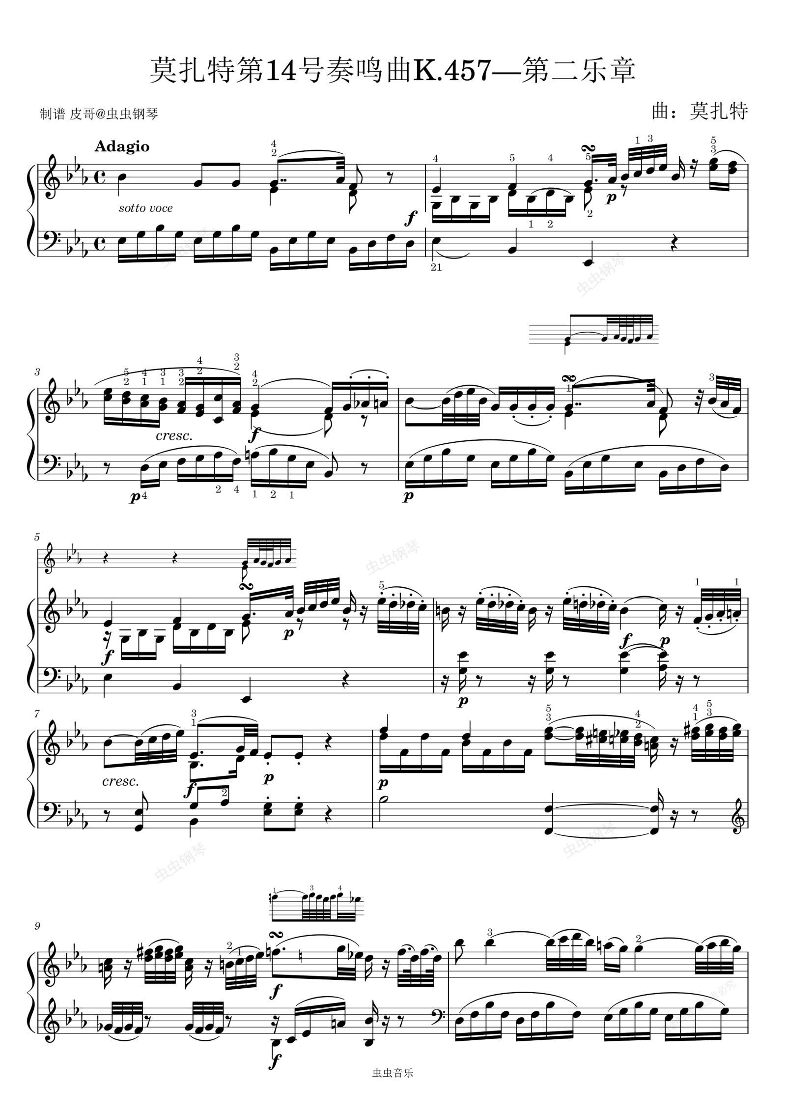 钢琴谱:莫扎特第14号奏鸣曲K.457—第二乐章 降E大调 原版钢琴谱