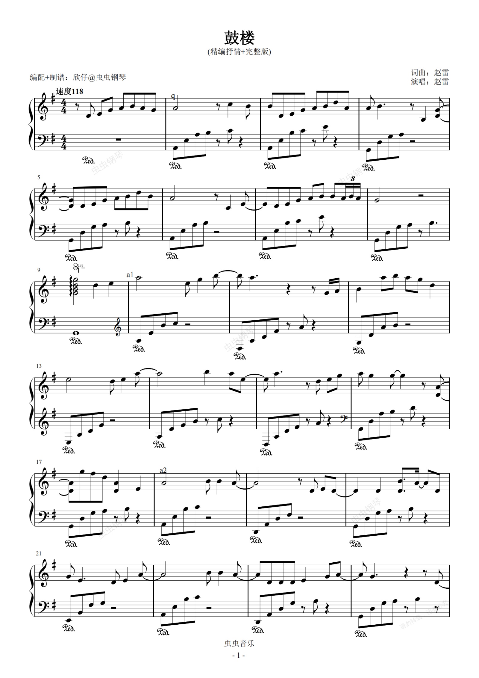 钢琴谱:赵雷-G《鼓楼》(精编抒情+完整版)