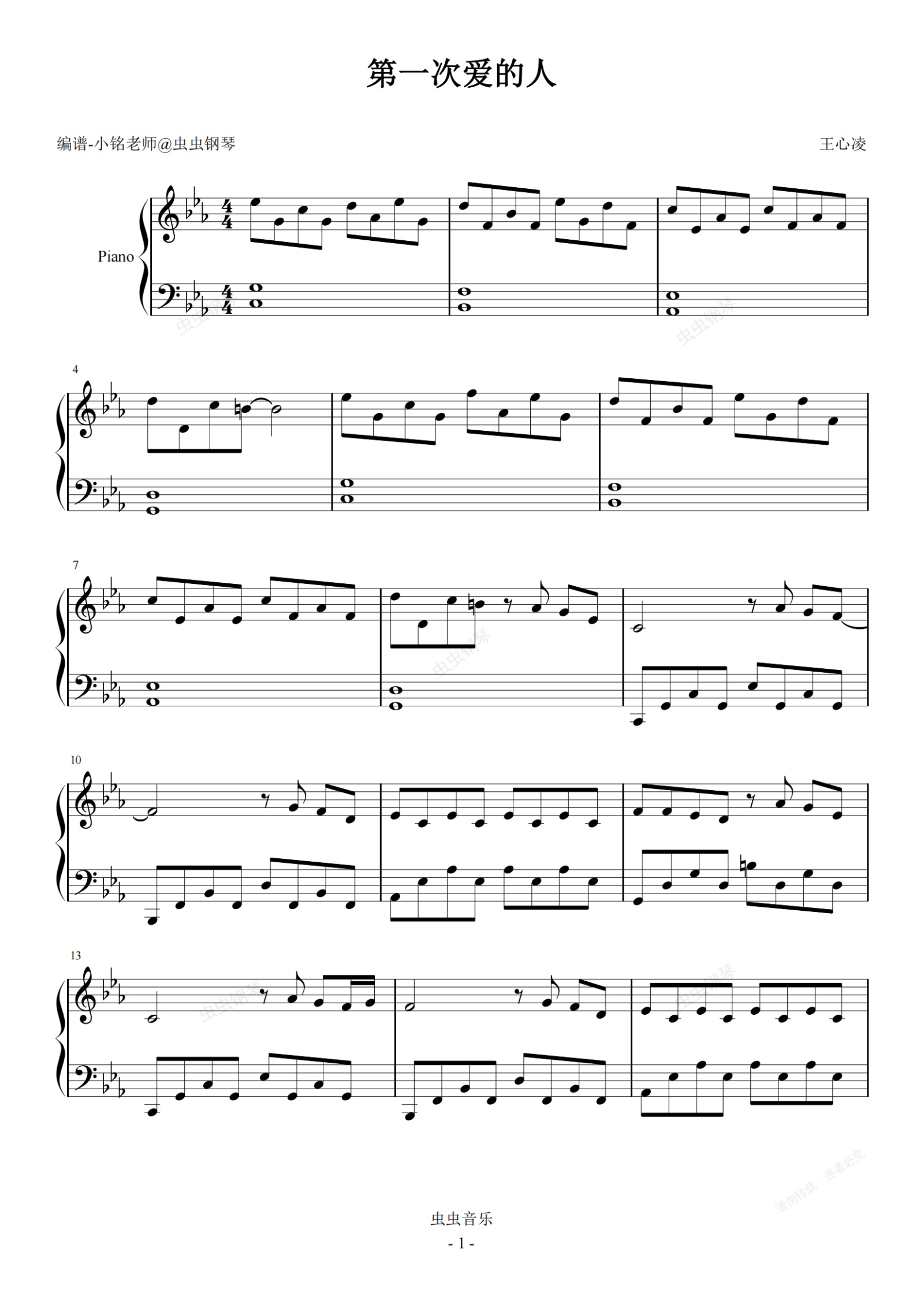 钢琴谱:第一次爱的人【原调 简易】