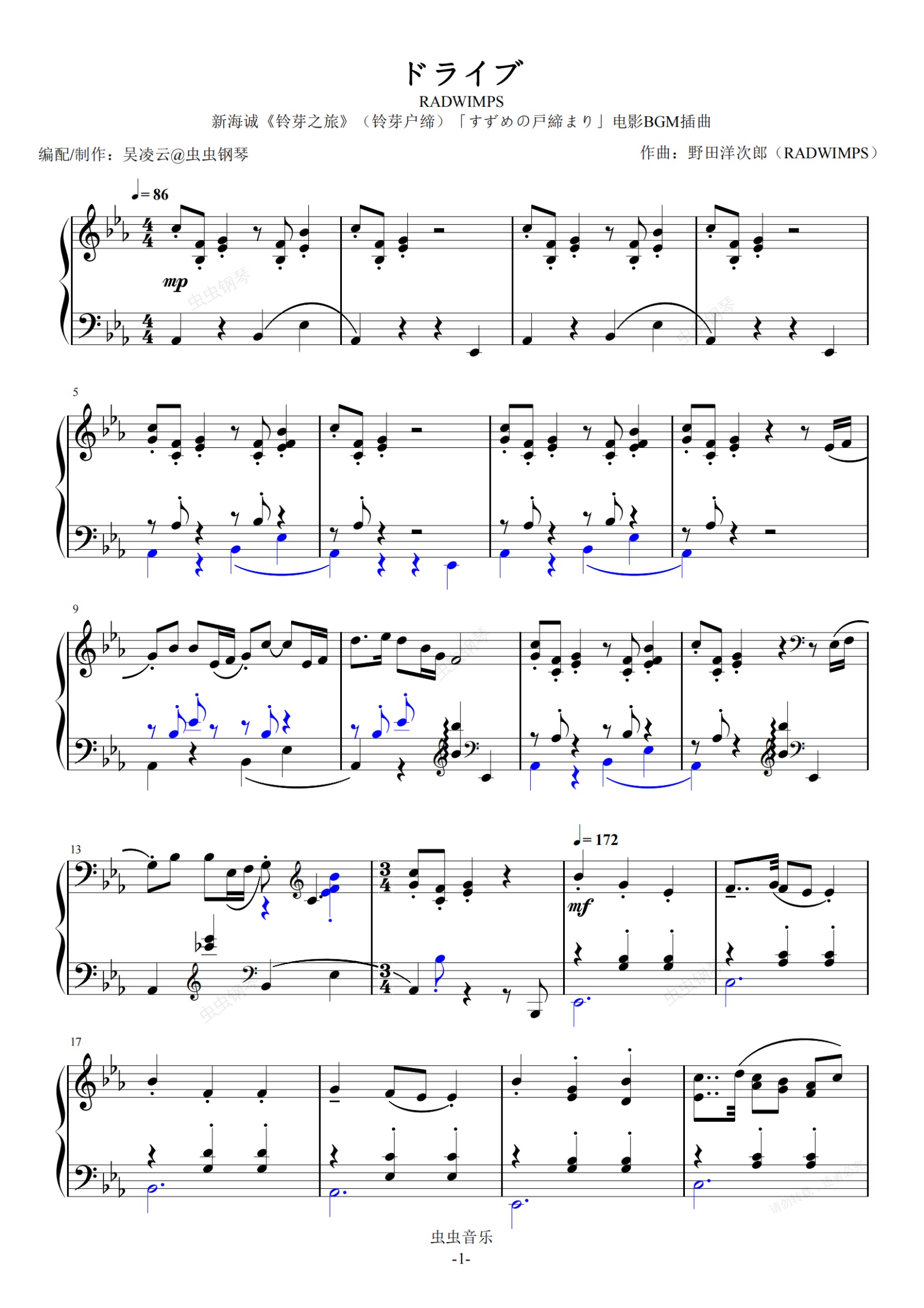 钢琴谱:ドライブ-RADWIMPS 新海诚《铃芽之旅》(铃芽户缔)「すずめの戸締まり」电影BGM插曲