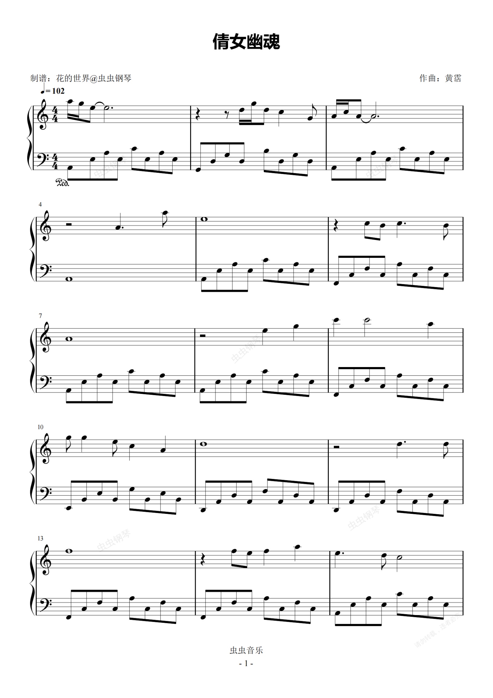 钢琴谱:情女幽魂 C调简易版 张国荣 流行经典