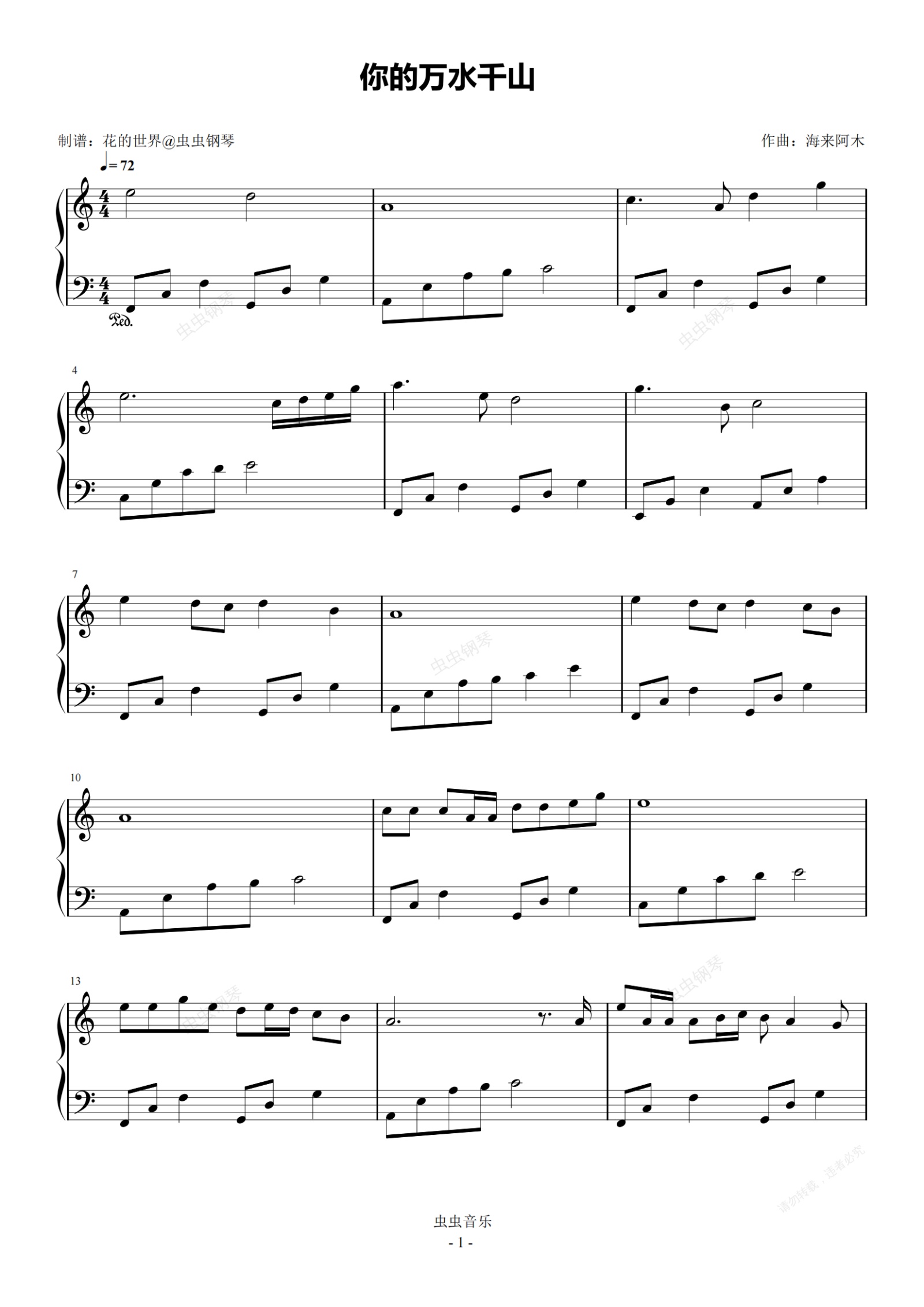 钢琴谱:你的万水千山 C调简易版 海来阿木