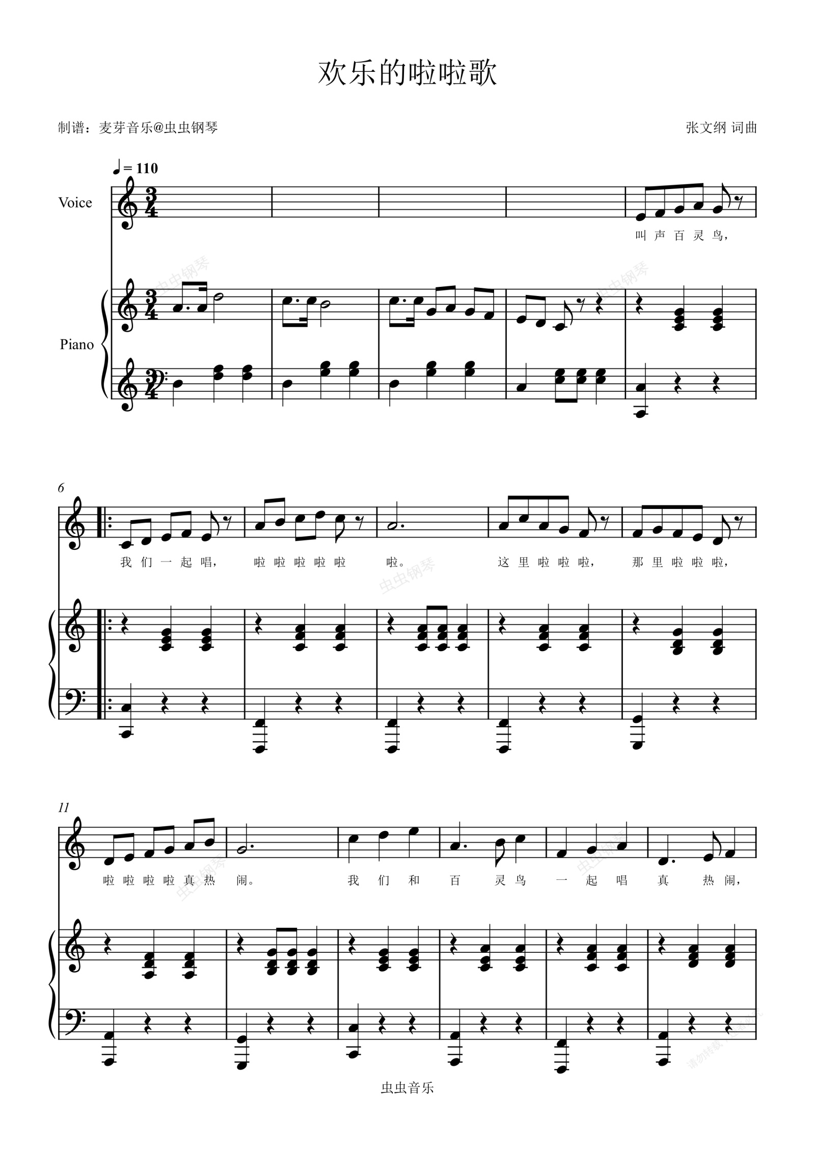 钢琴谱:欢乐的啦啦歌(弹唱版)