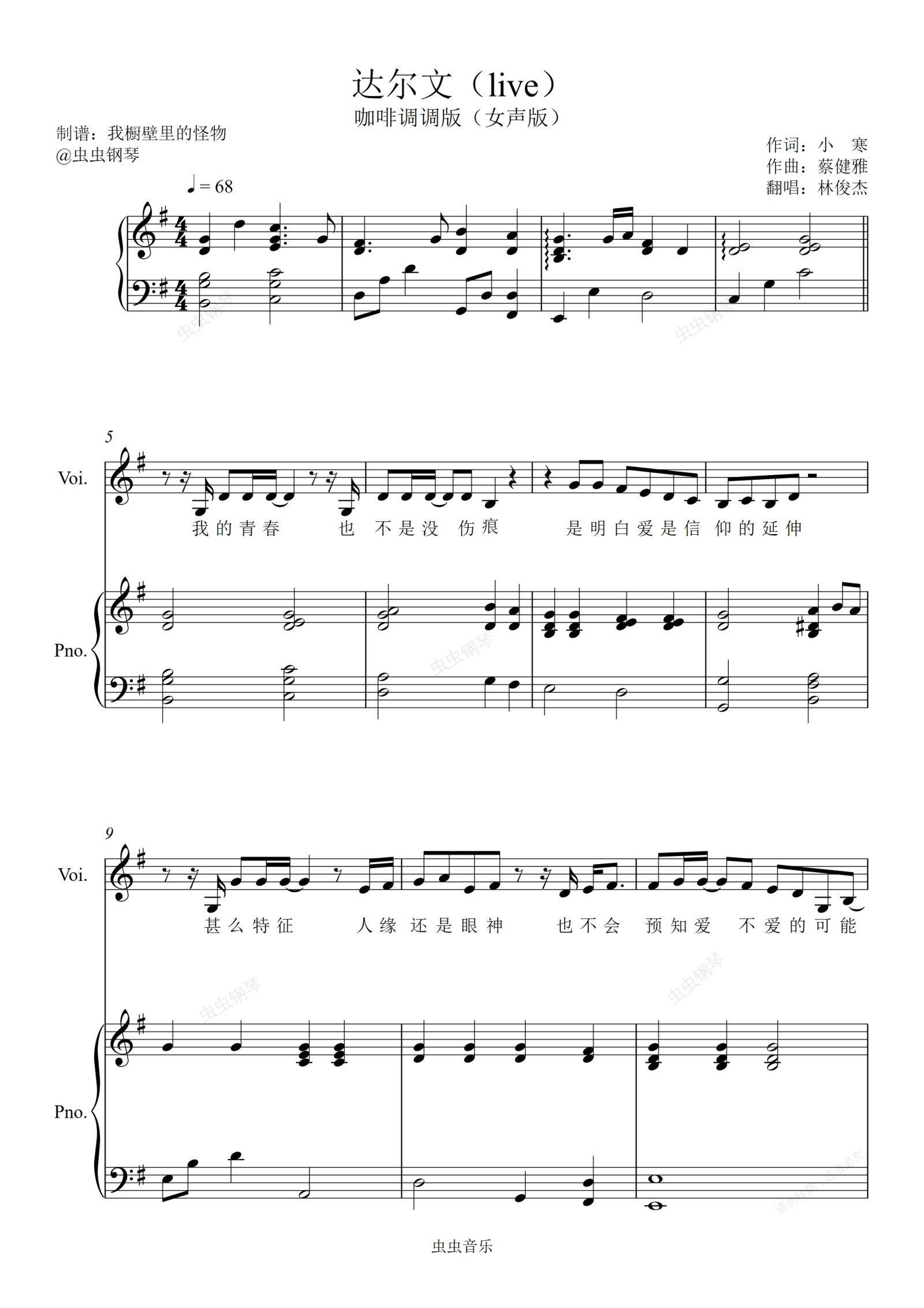 钢琴谱:《达尔文》G调女版弹唱(林俊杰咖啡调调版)
